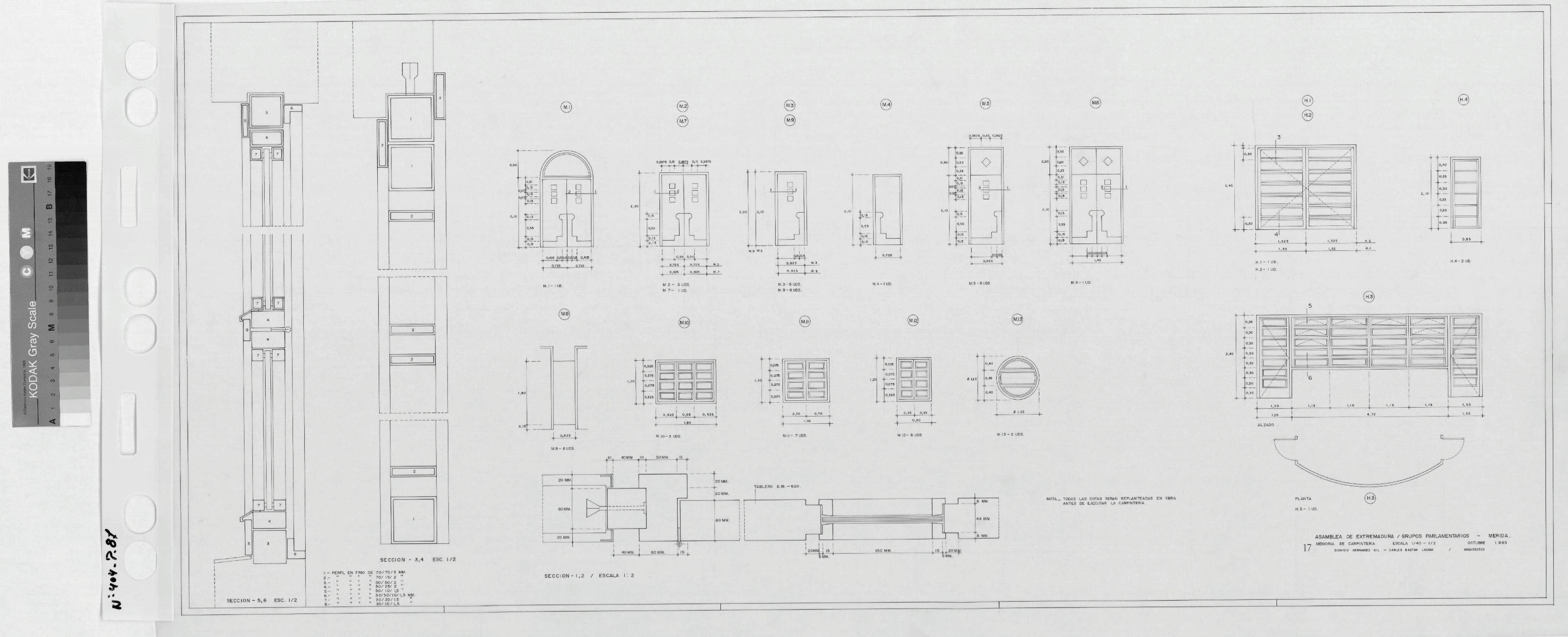 ASAMBLEA DE EXTREMADURA PROYECTO DE REHABILITACIÓN DEL ANTIGUO HOSPITAL DE S. JUAN DE DIOS PARA SEDE DE LA ASAMBLEA: MEMORIA DE CARPINTERIA Pone en sello " Asamblea de Extremadura - Grupos Parlamentarios" Con tipos y número de unidades, con tres detalles-sección a E: 1/2 Con cotas y notas. Sin firmar
