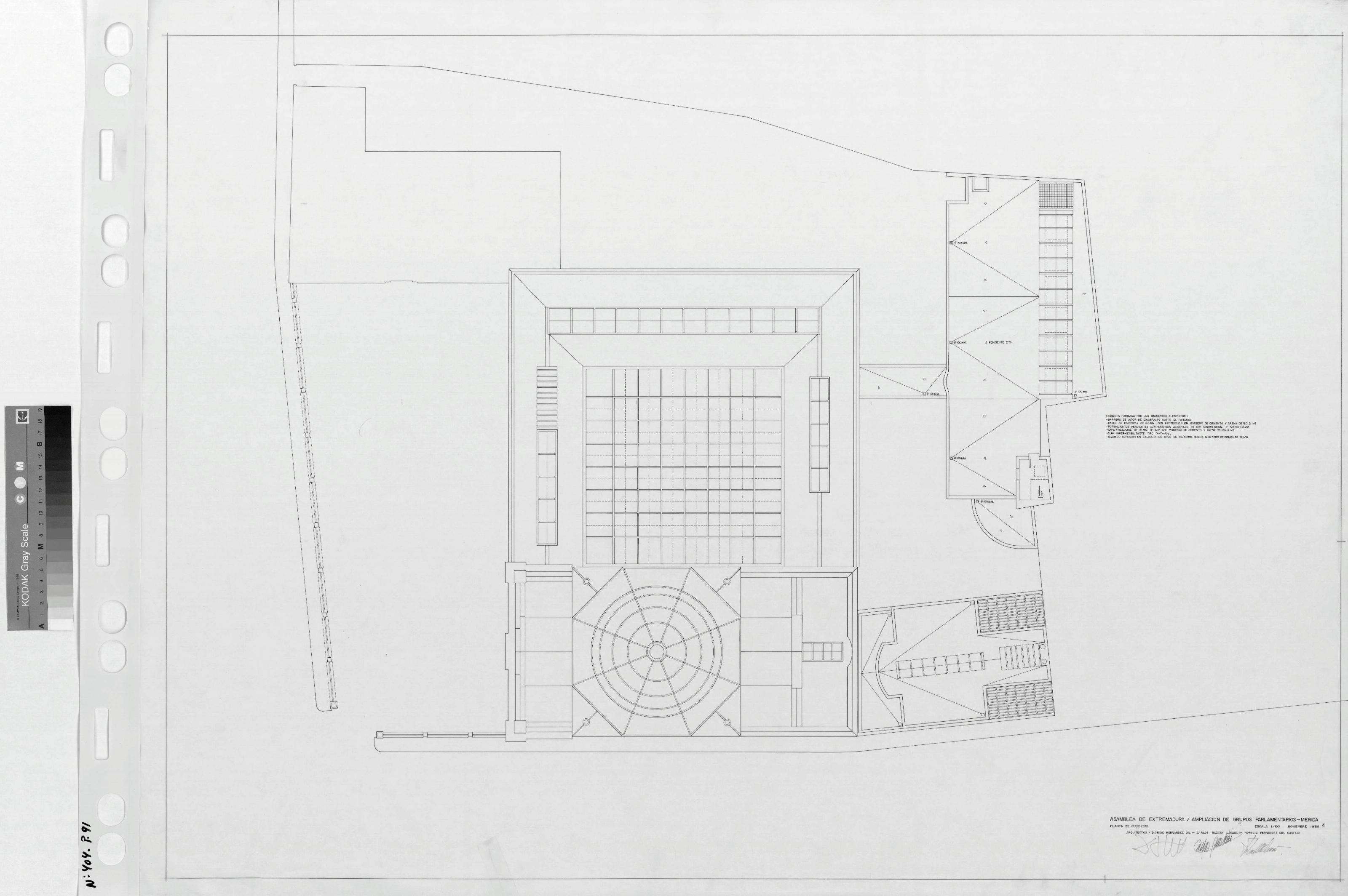 ASAMBLEA DE EXTREMADURA PROYECTO DE REHABILITACIÓN DEL ANTIGUO HOSPITAL DE S. JUAN DE DIOS PARA SEDE DE LA ASAMBLEA: PLANTA DE CUBIERTAS Pone en sello " Asamblea de Extremadura Ampliación de Grupos Parlamentarios" Con notas sobre la formación de cubierta. Firmado