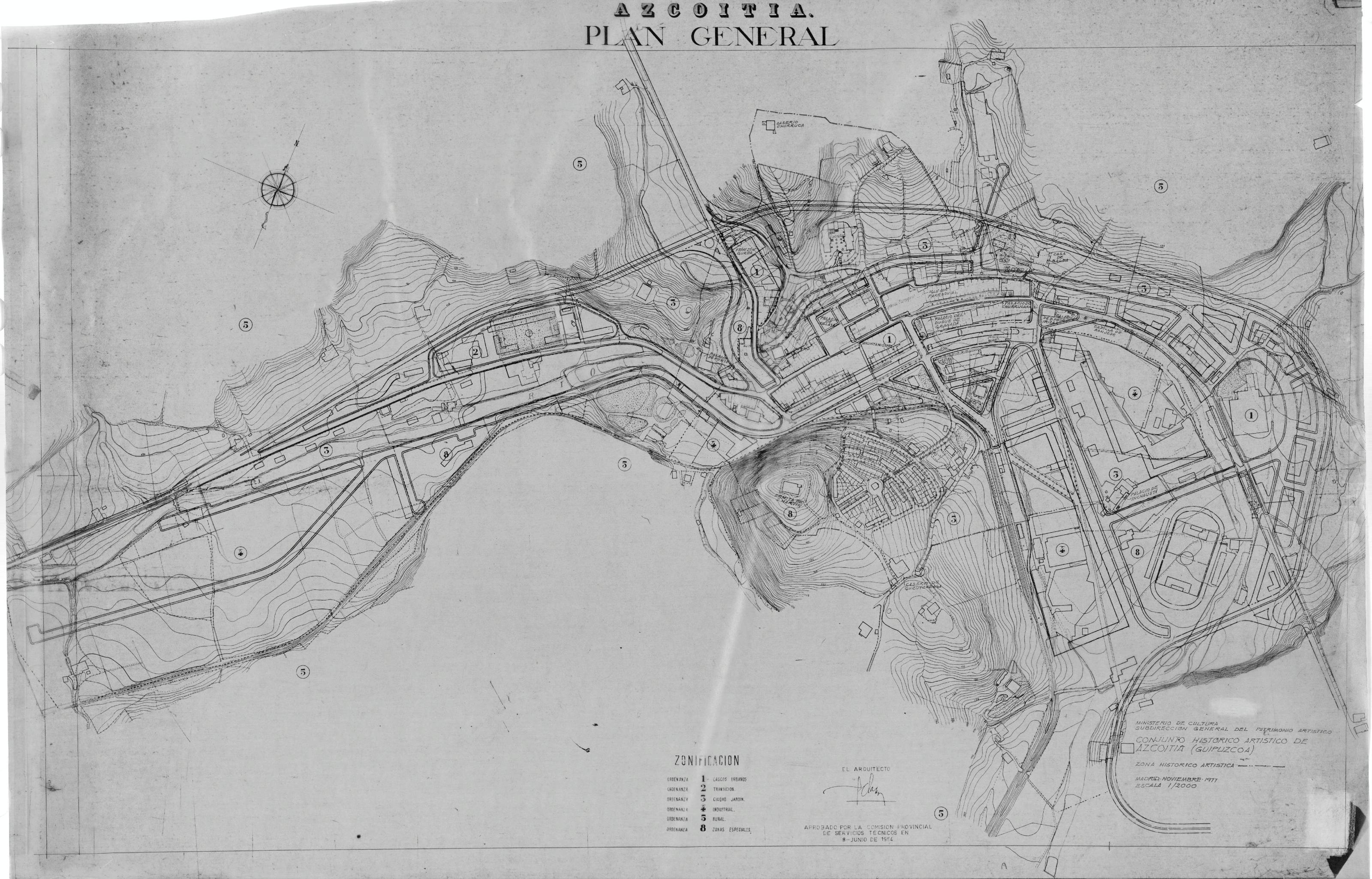 CONJUNTO HISTORICO ARTISTICO DE AZCOITIA (Guipúzcoa): PLAN GENERAL Ubicación de la zona histórico artística en la localidad. Con curvas de nivel. Señala accesos y situación de monumentos. Contiene leyenda de zonificación.