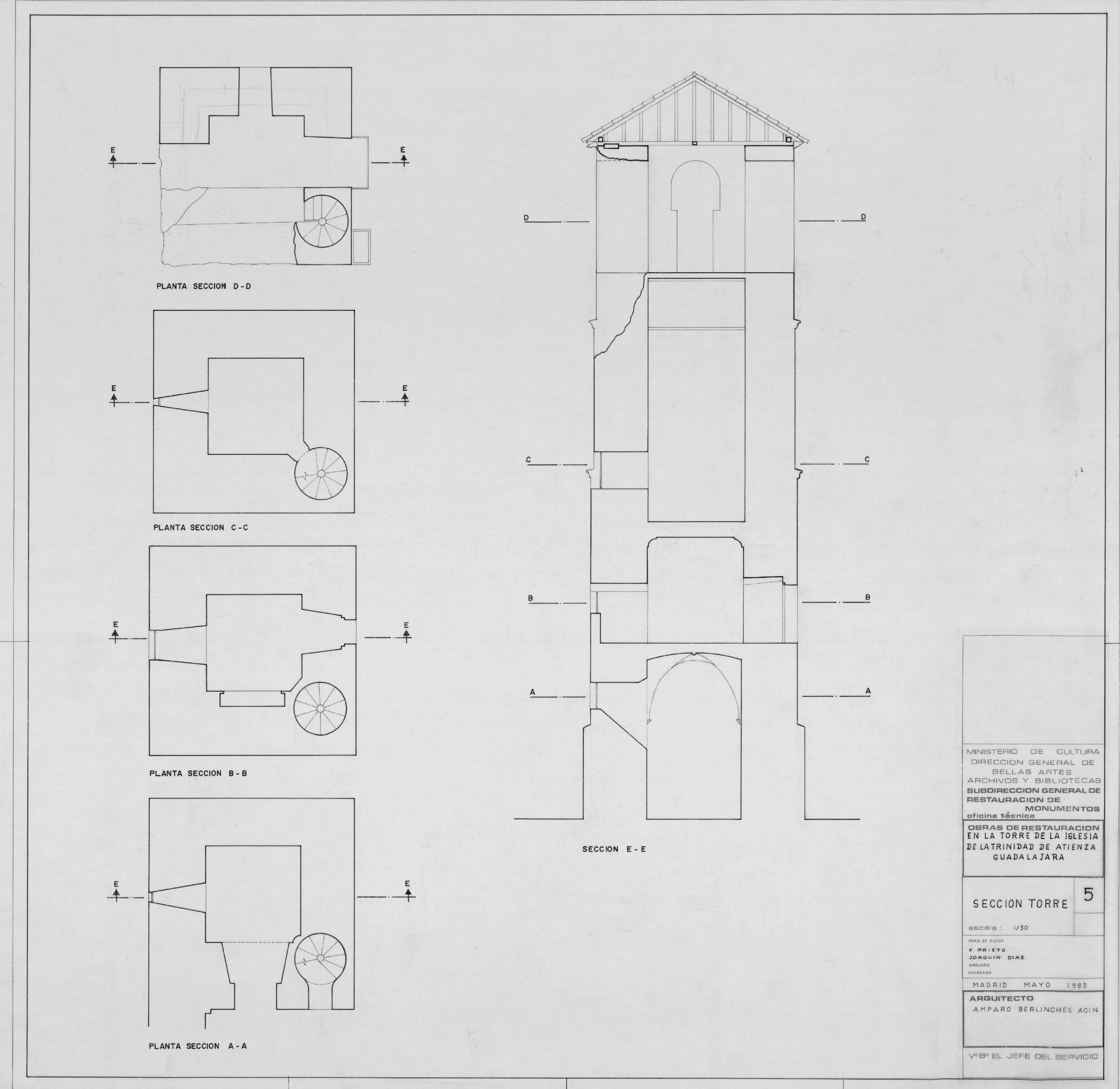TORRE DE LA IGLESIA DE LA TRINIDAD - ATIENZA - GUADALAJARA-: SECCION TORRE, Plano de seccion , que a su vez esta marcado con distintos cortes en alturas, las plantas de estas secciones estan dibujadas , no marca cotas de altura, plano sin cotas ,