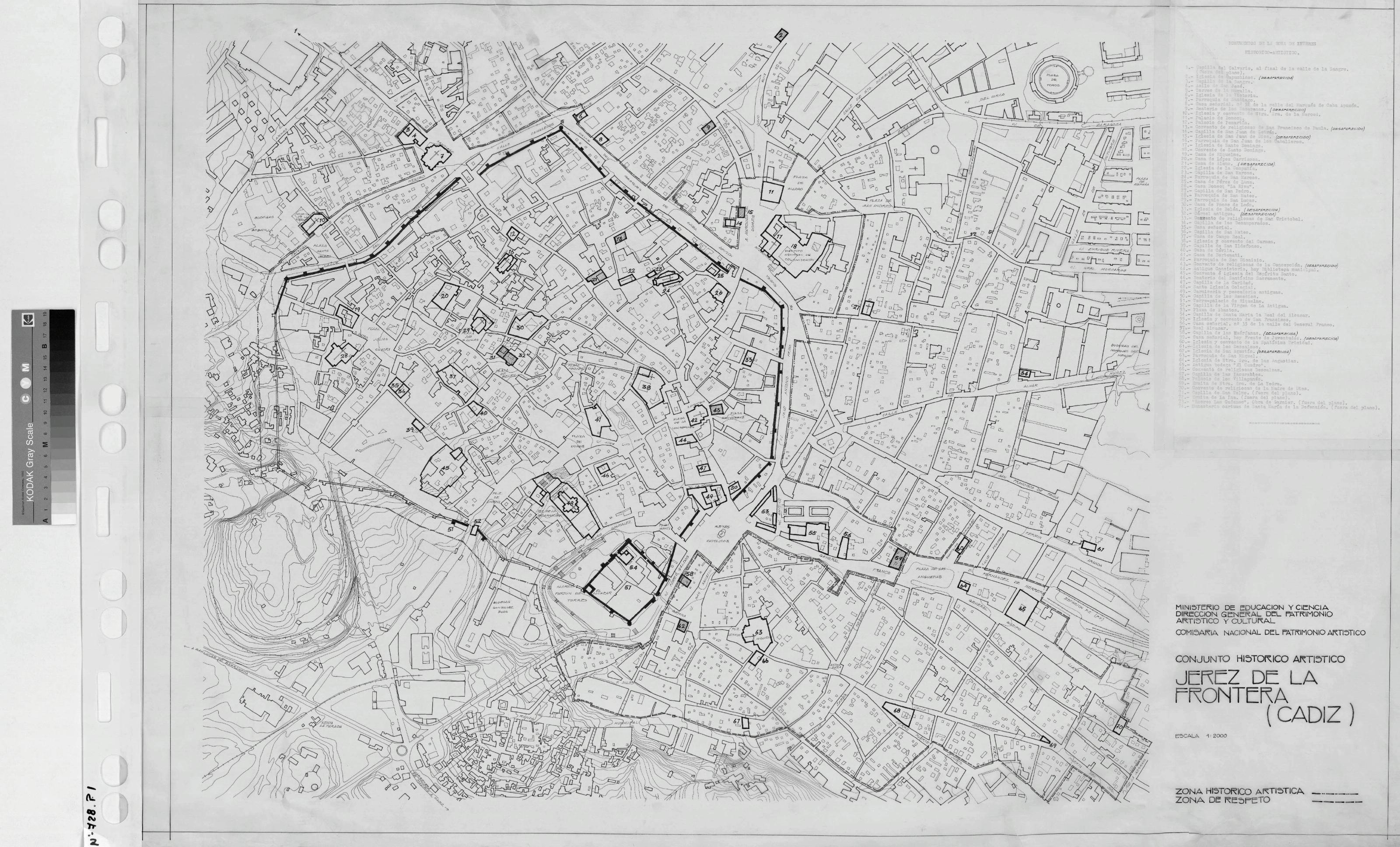 JEREZ DE LA FRONTERA: PLANTA GENERAL DEL CONJUNTO HISTORICO ARTISTICO CON SEÑALIZACION DE LA ZONA HISTORICA Y ZONA DE RESPETO