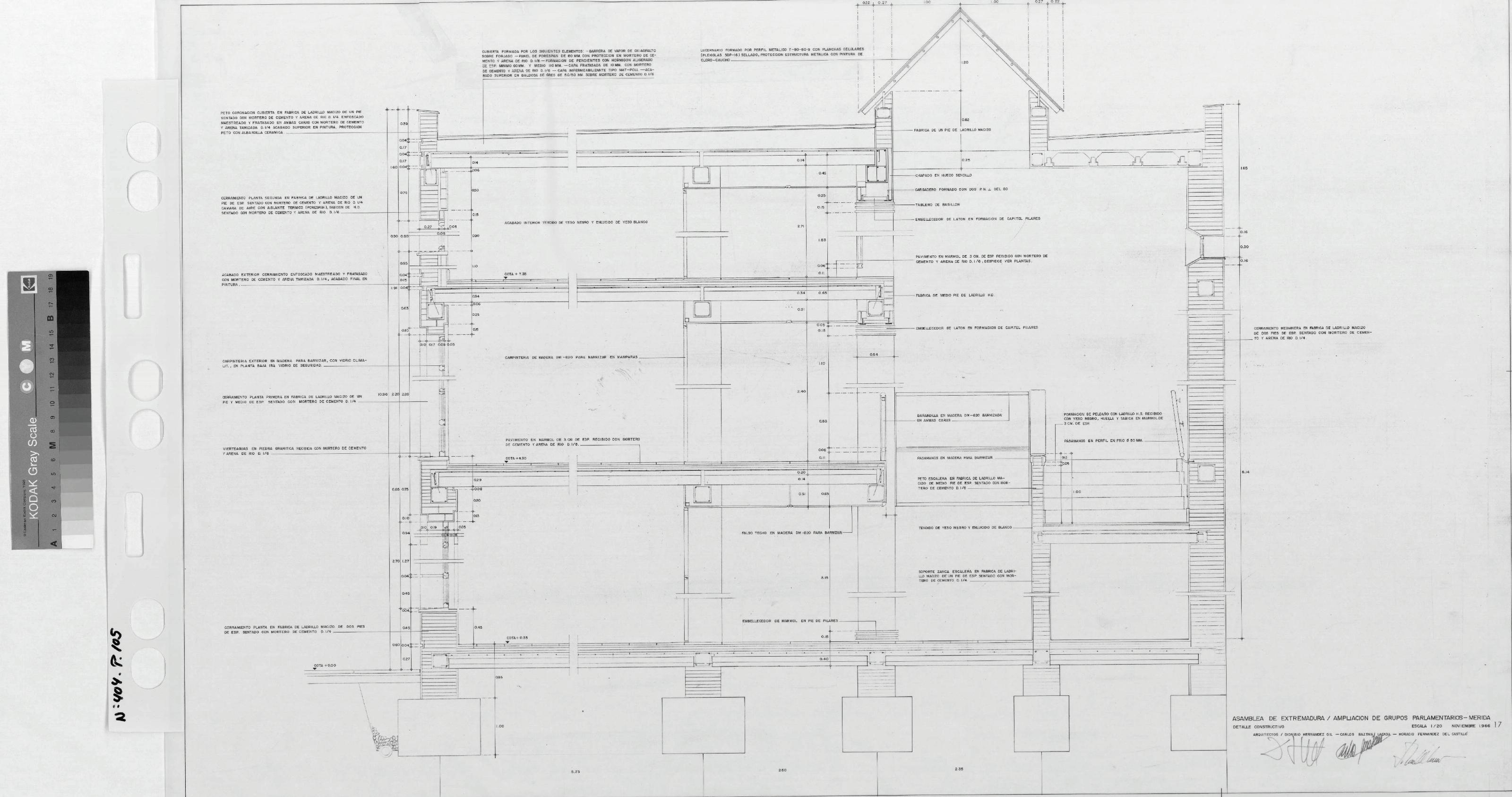ASAMBLEA DE EXTREMADURA PROYECTO DE REHABILITACIÓN DEL ANTIGUO HOSPITAL DE S. JUAN DE DIOS PARA SEDE DE LA ASAMBLEA: DETALLE CONSTRUCTIVO Pone en sello " Asamblea de Extremadura Ampliación de Grupos Parlamentarios" Sección con profusión de cotas y notas sobre acabados Con cotas y notas. Sin firmar