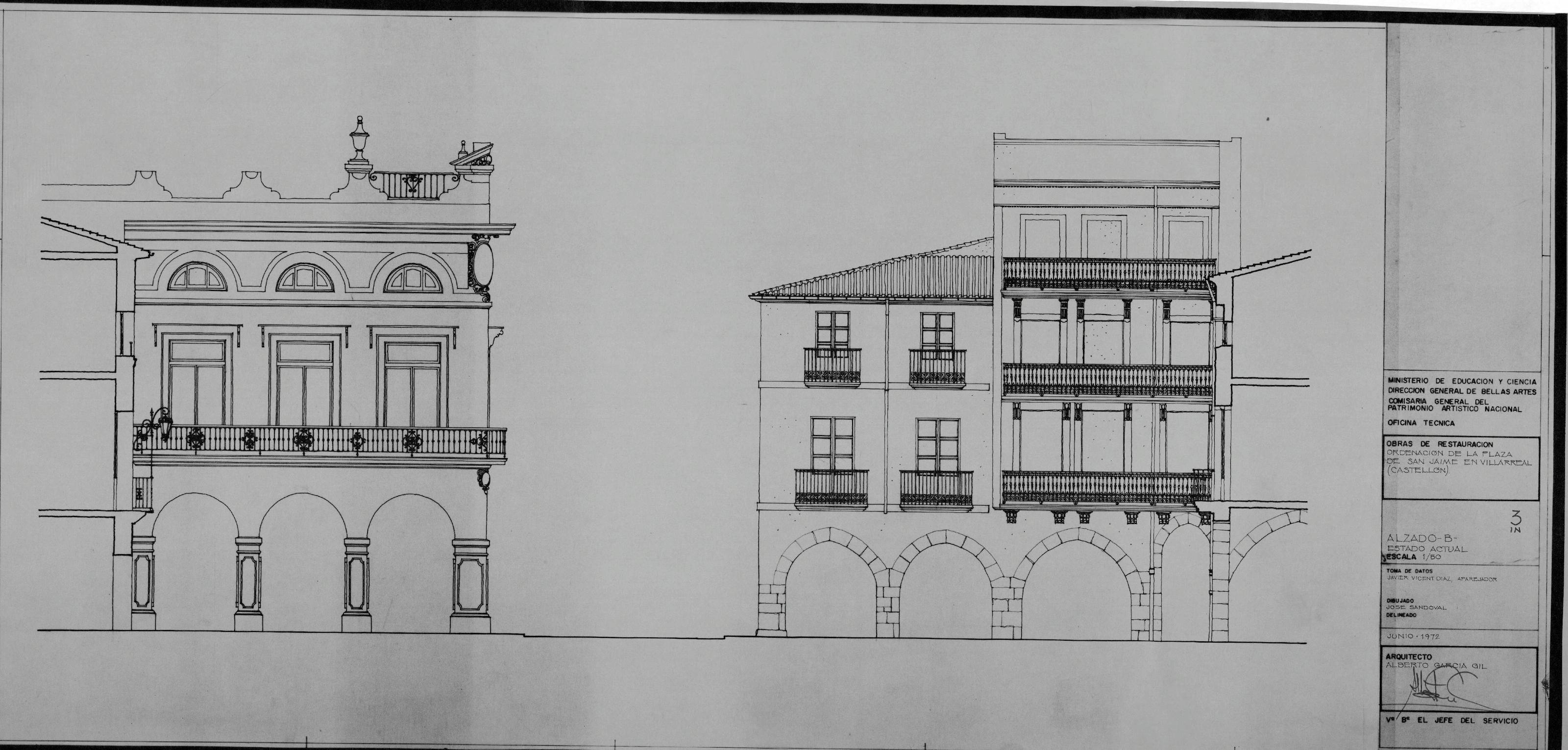 PLAZA DE SAN JAIME, ORDENACION. VILLARREAL . -CASTELLON -: ALZADO -B- . Estado actual, alzado donde se ven dos edificios que se supone que dan a la plaza, con soportales y balconadas, no sabemos el numero de las viviendas y el nombre por el que se las conoce, plano sin cotas.