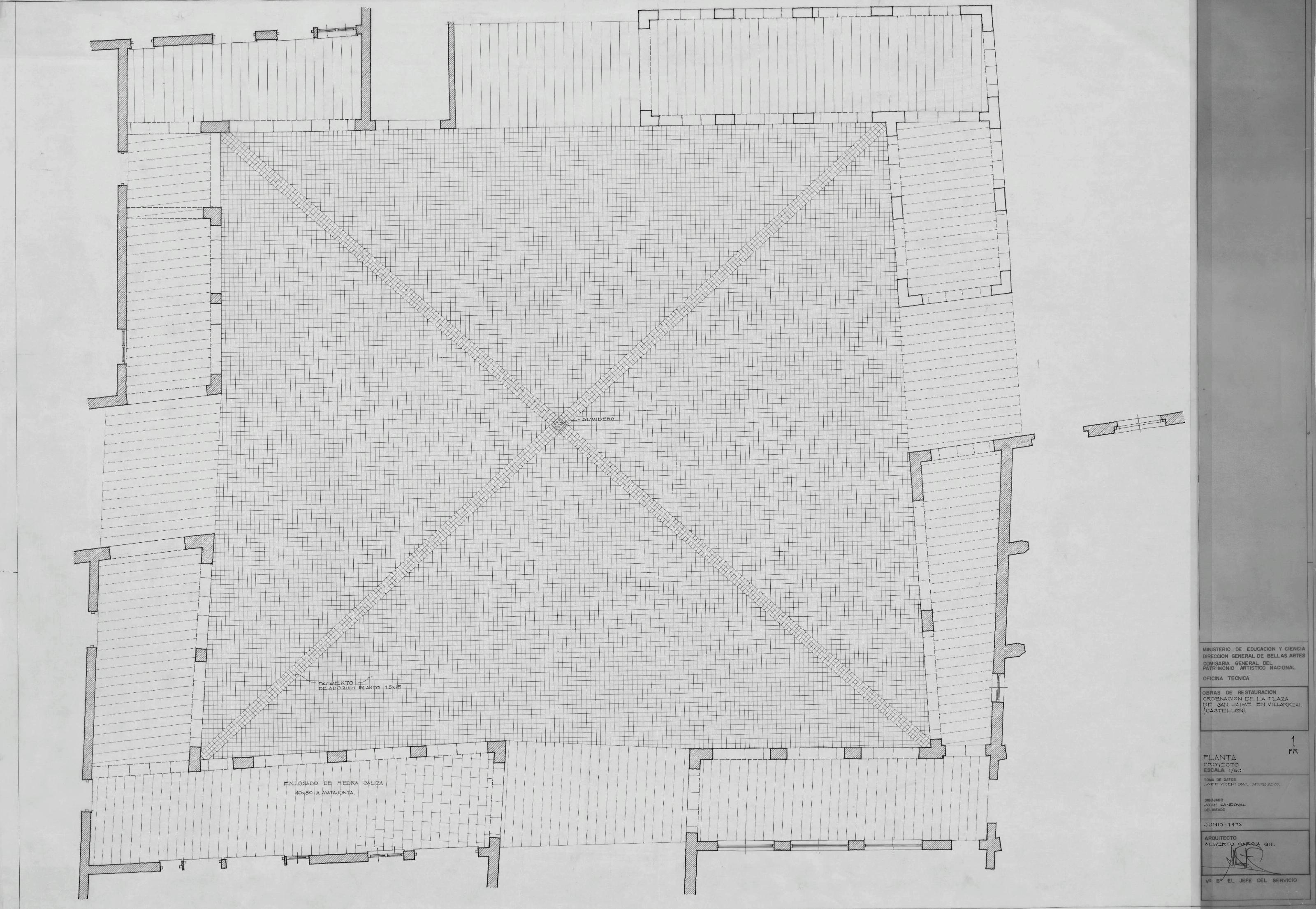 PLAZA DE SAN JAIME, ORDENACION. VILLARREAL . -CASTELLON -: PLANTA PROYECTO.plano donde esta dibujado el pavimento de la plaza y el enlosdado de los soportales , plano sin cotas.