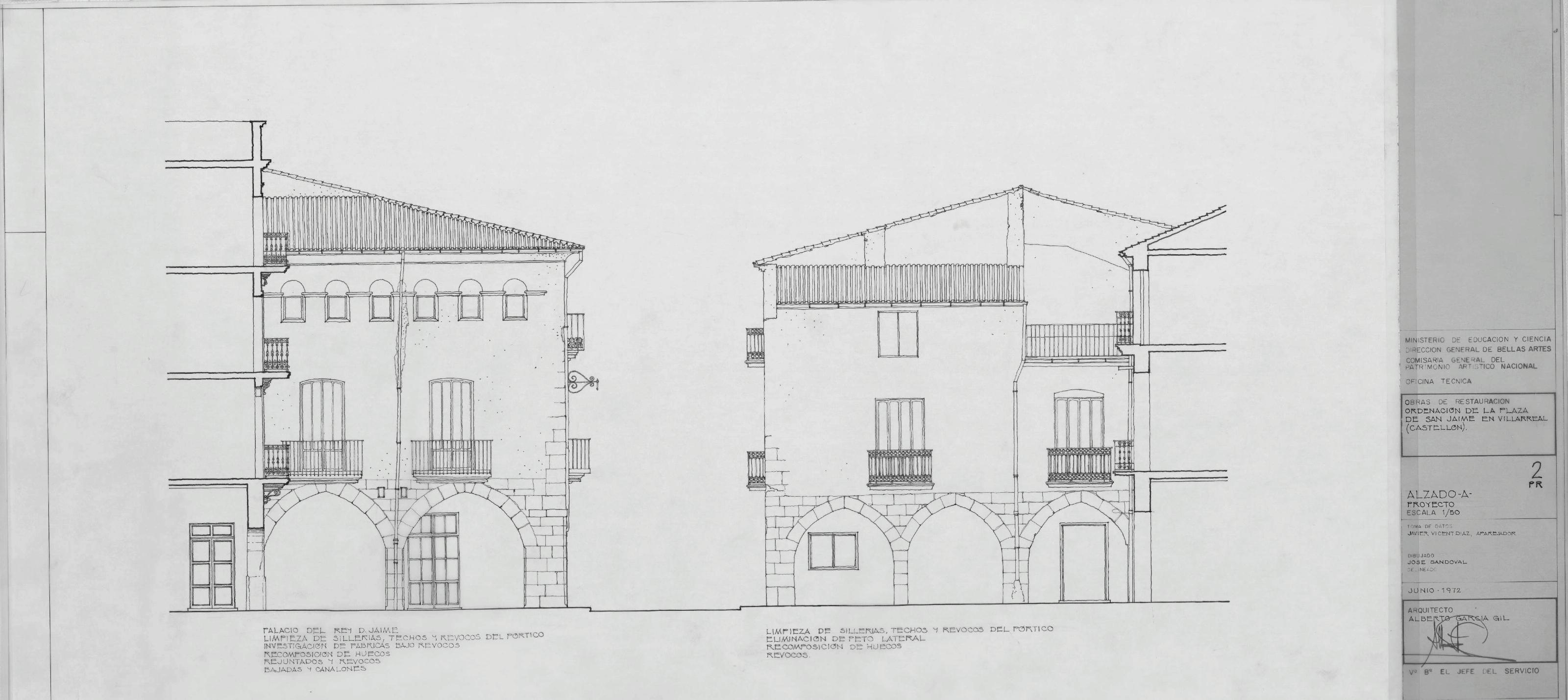 PLAZA DE SAN JAIME, ORDENACION. VILLARREAL . -CASTELLON -: ALZADO -A- PROYECTO .plano donde aparece una leyenda de las labores a realizar, como limpieza de sillares, techos, rebocos del portico... plano sin cotas.
