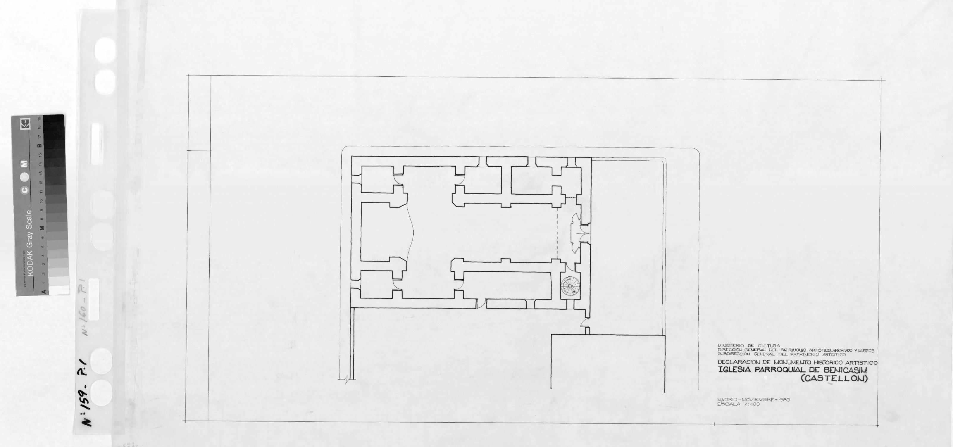 IGLESIA PARROQUIAL DE BENICASIM -CASTELLON -: PLANTA GENERAL . Planta de la iglesia, plano parcial de distribucion, muros regruesados, huecos de acceso dibujado,dibujo sin acotar.