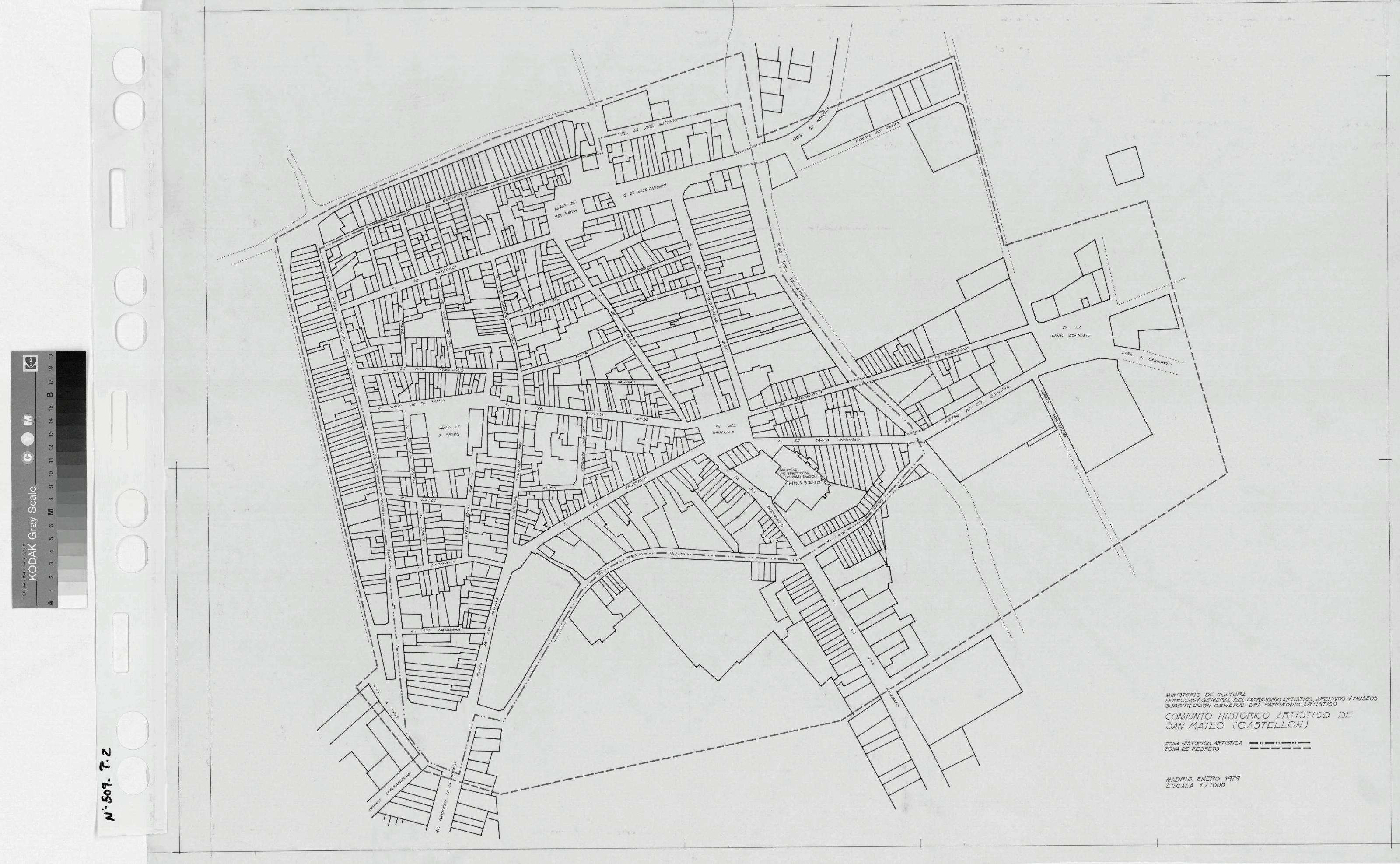 CONJUNTO HISTORICO ARTISTICO DE SAN MATEO.- CASTELLON-: PLANO DE SITUACION, o emplazamiento del conjunto de San Mateo, estan marcadas las calles, y algunos monumentos, tambien aparecen dos zonas señaladas una marca la zona de respeto y otra la historica, plano sin cotas.
