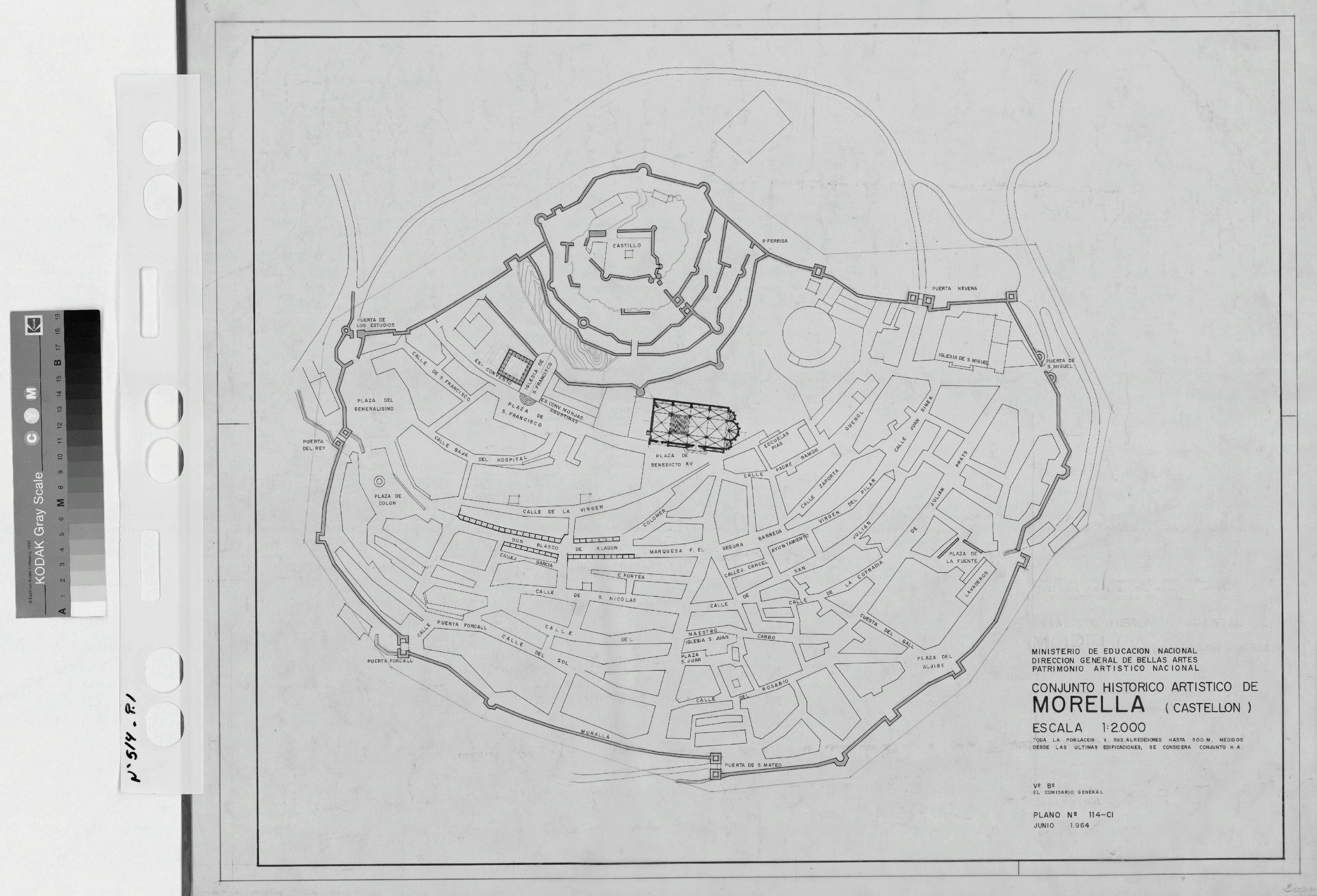 CONJUNTO HISTORICO ARTISTICO DE MORELLA. - CASTELLON-: PLANO DE SITUACION, o emplazamiento del conjunto de Morella , en este plano aparece marcada toda la zona de la ciudad de Morella, con la muralla , el castillo, algunos monumentos y sus calles. plano sin cotas.