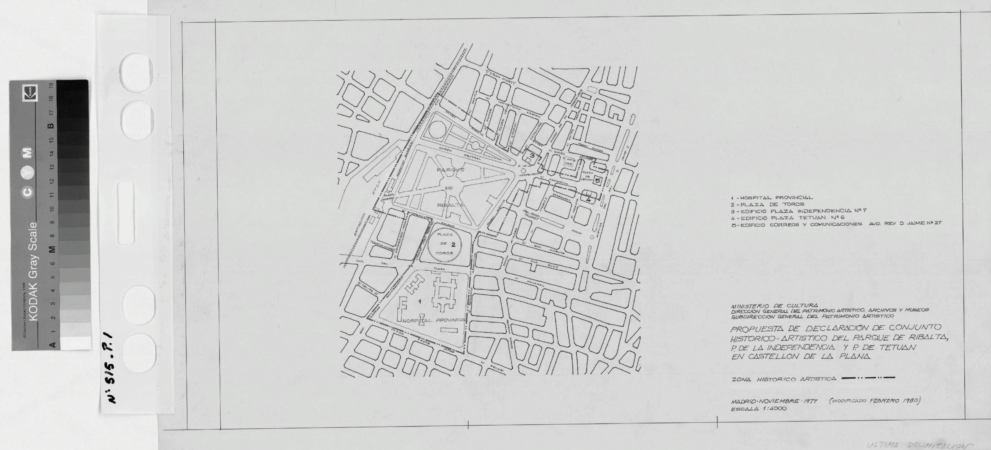 CONJUNTO HISTORICO ARTISTICO (PROPUESTA) DEL PARQUE DE RIBALTA,- CASTELLON DE LA PLANA. -: PLANO DE SITUACION, o emplazamiento de la propuesta del conjunto historico del parque de Ribalta, P. De la Independencia y P. de Tetuan, vemos marcada una leyenda con edificios pertenecientes al casco antiguo, y la delimitacion de propuesta del conjunto. plano sin cotas.