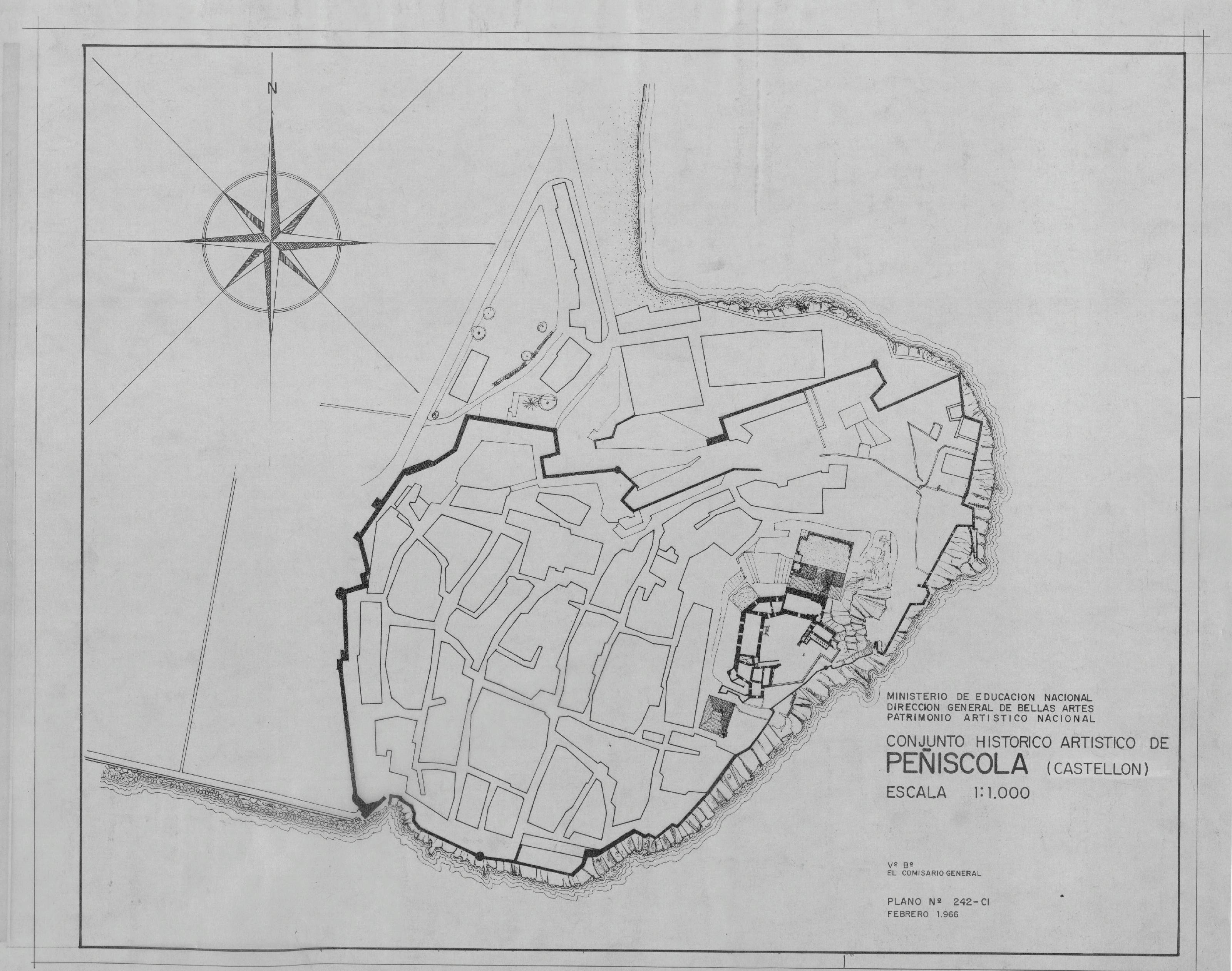 CONJUNTO HISTORICO ARTISTICO DE PEÑISCOLA. -CASTELLON: PLANO DE SITUACION, o emplazamiento del conjunto historico de Peñiscola, vemos marcados edificios pertenecientes al casco antiguo, plano sin cotas.