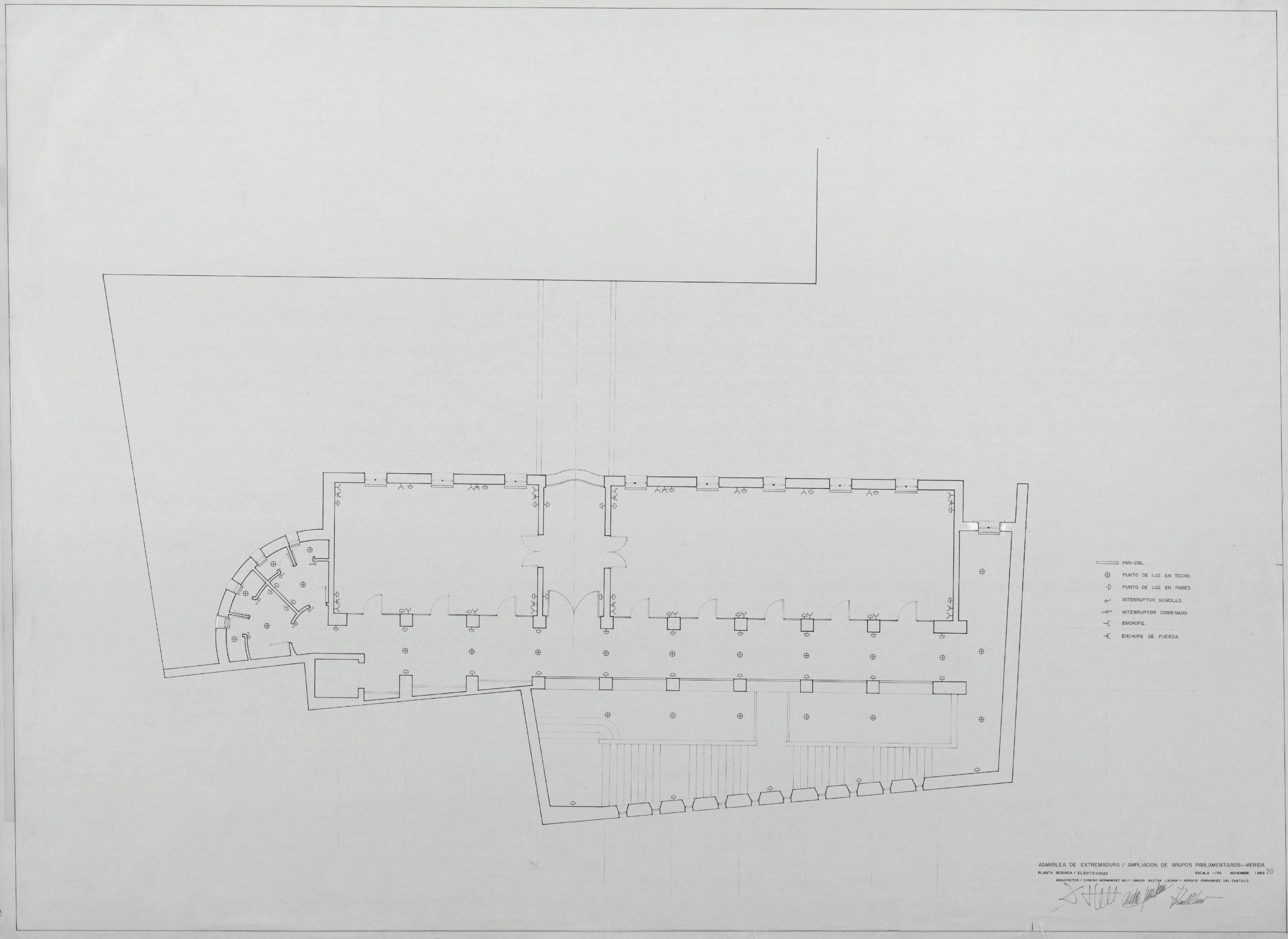 ASAMBLEA DE EXTREMADURA PROYECTO DE REHABILITACIÓN DEL ANTIGUO HOSPITAL DE S. JUAN DE DIOS PARA SEDE DE LA ASAMBLEA: PLANTA SEGUNDA ELECTRICIDAD Pone en sello " Asamblea de Extremadura Ampliación de Grupos Parlamentarios" Con representación de mecanismos y leyenda. Firmado