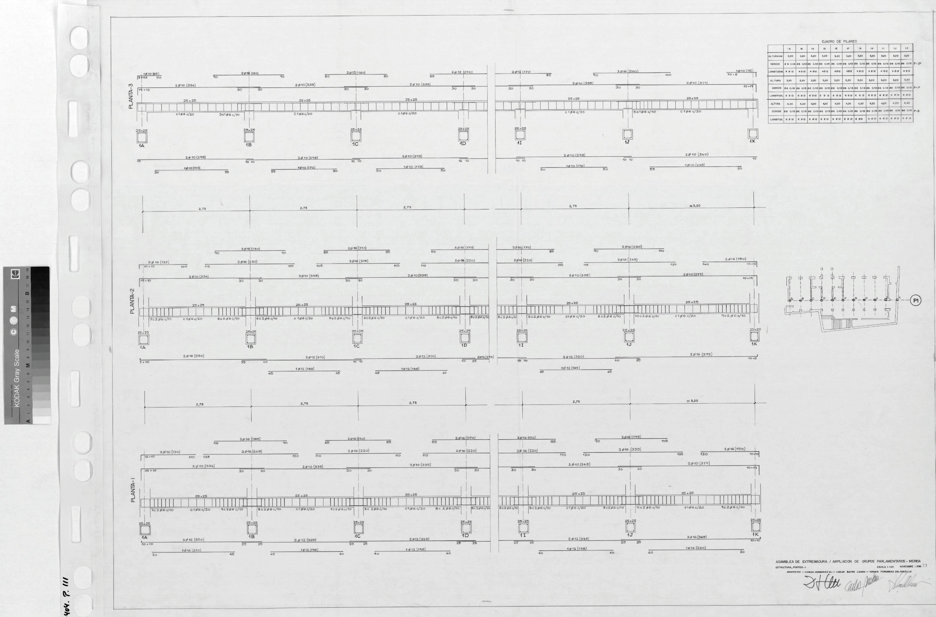 ASAMBLEA DE EXTREMADURA PROYECTO DE REHABILITACIÓN DEL ANTIGUO HOSPITAL DE S. JUAN DE DIOS PARA SEDE DE LA ASAMBLEA: ESTRUCTURA PORTICO 1 Pone en sello " Asamblea de Extremadura Ampliación de Grupos Parlamentarios" Dibujo seccionado del pórtico en los 3 niveles con sus armaduras, cotas y calibres. Con cuadro de pilares y pequeña planta para identificación del pórtico. Firmado