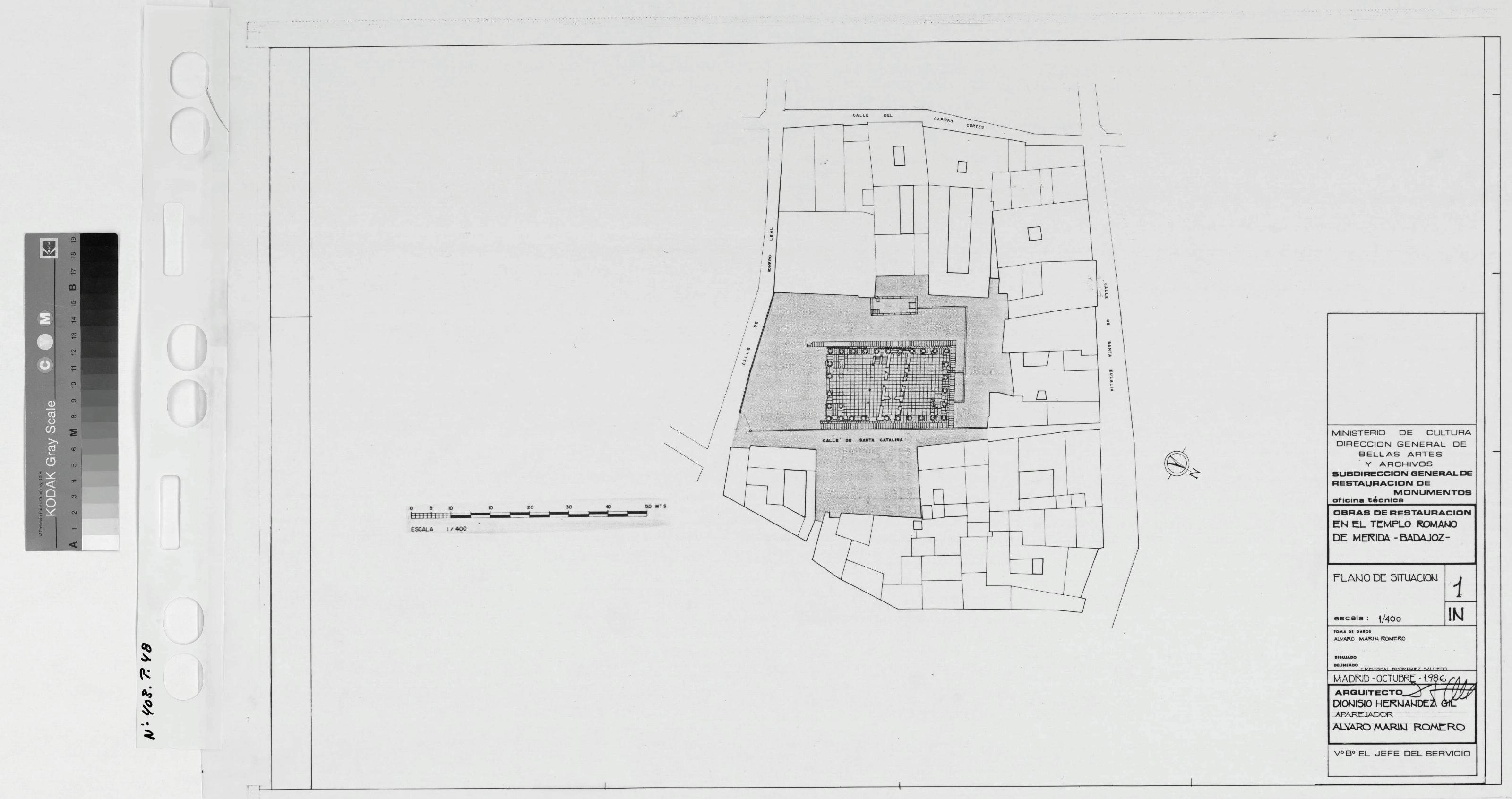 OBRAS DE RESTAURACION EN EL TEMPLO ROMANODE MERIDA (Badajoz): PLANO DE SITUACIONCon dibujo de planta a escala y solar sombreadoCalles y solares adyacentesCon escala gráfica Firmado