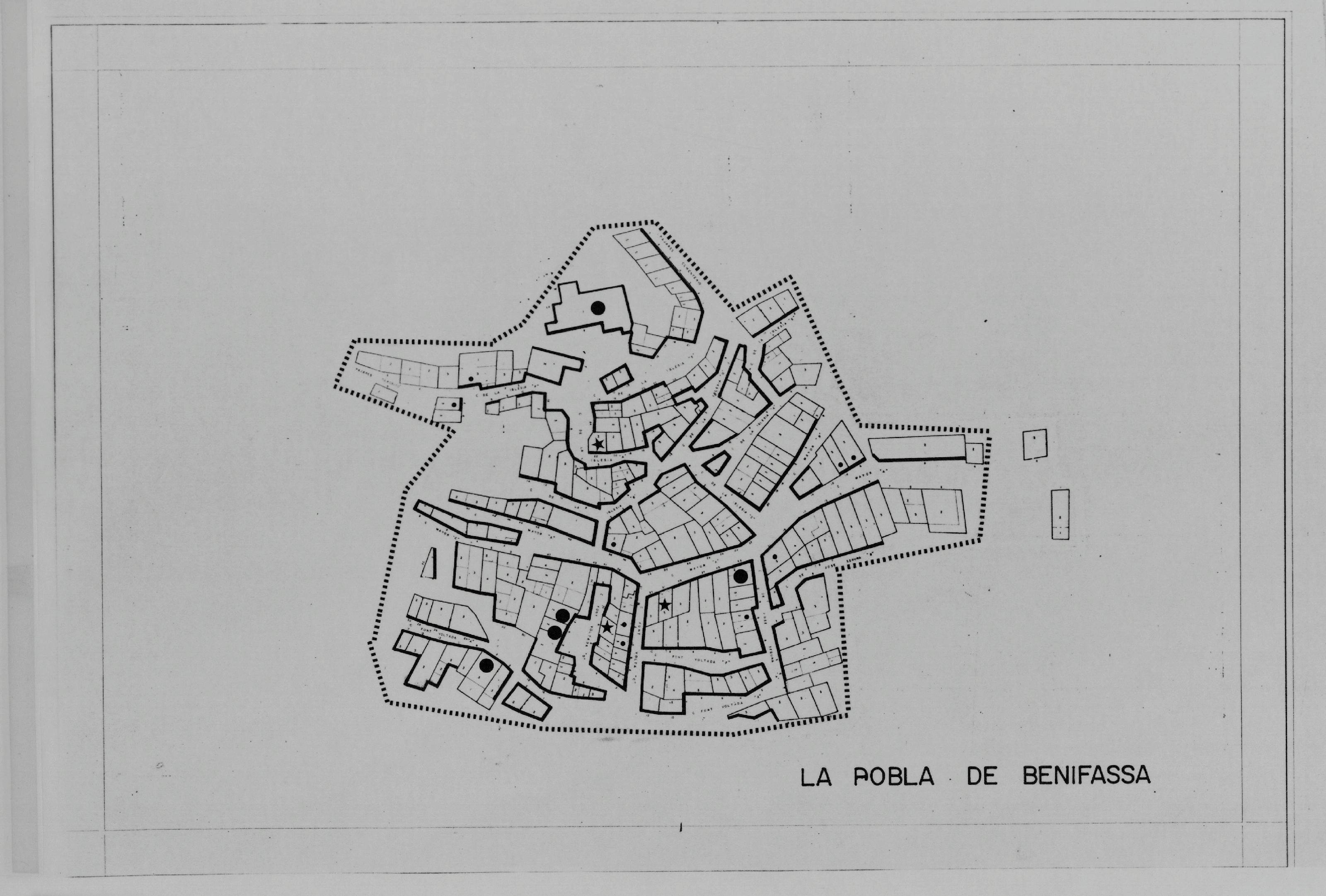 CONJUNTO HISTORICO ARTISTICO DE LA POBLA DE BENIFASSA. -CASTELLON-: PLANO DE SITUACION, o emplazamiento de la delimitacion de la zona historica de la ciudad , plano sin cotas, reducido.