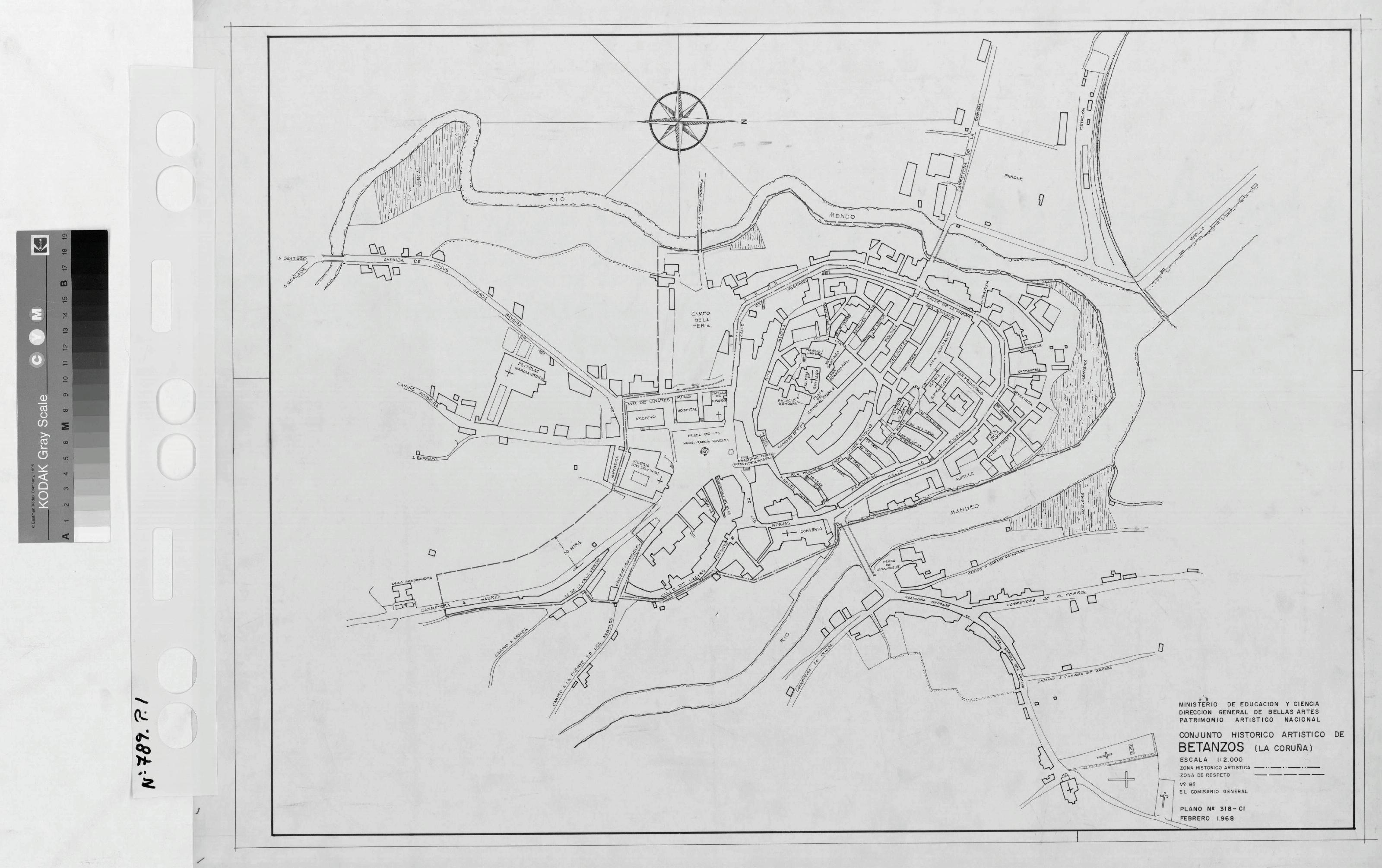 CONJUNTO HISTORICO ARTISTICO DE BETANZOS - LA CORUÑA -: PLANO SITUACION,o emplazamiento, plano donde estan marcadas una zona de respeto y otra historica artistica, tambien estan señaladas las calles y los monumentos,plano sin acotar.