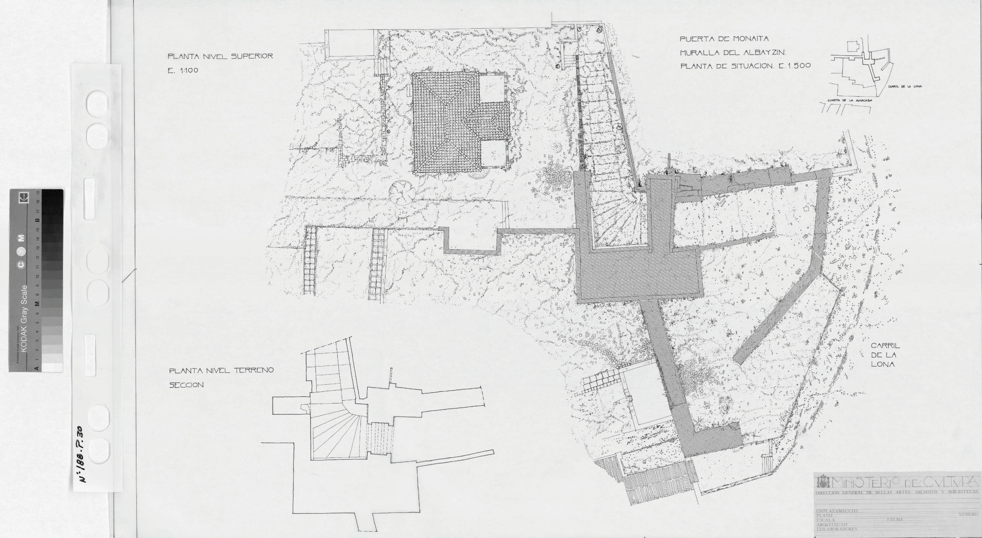 MURALLAS DEL ALBAYCIN PUERTA DE MONAITA .- GRANADA-: PUERTA MONAITA. PLANTA DE SITUACION.. Planta general , con plano de situacion, planta nivel superior y planta a nivel de terreno tambien esta dibujado con detalle, El carril de la Lona, muralla sombreada y cubiertas muy dibujadas .plano sin cotas.