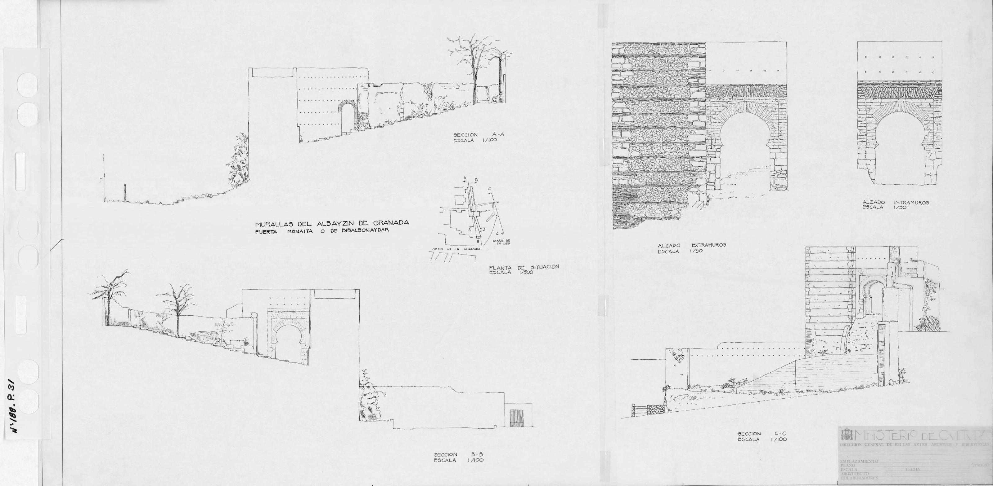 MURALLAS DEL ALBAYCIN PUERTA DE MONAITA .- GRANADA-: PLANOS, PUERTA MONAITA O BIBALBONAYDAR. Planta de situacion, alzados: intramuros , extramuros, y secciones. plano sin cotas.