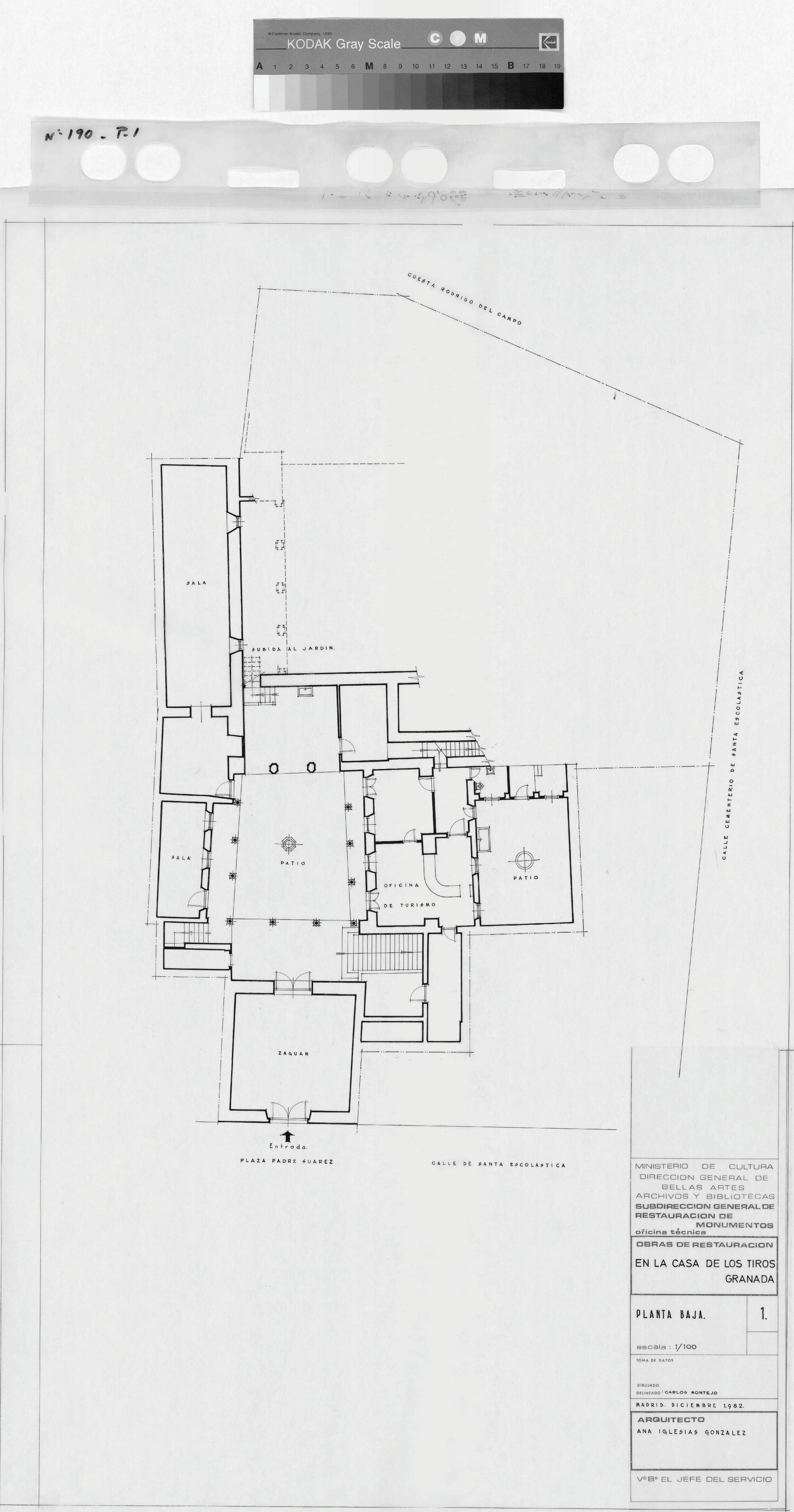 CASA DE LOS TIROS .- GRANADA-: PLANTA BAJA.. Planta de distribucion , señala cada dependencia, muros regruesados, y descripcion de calles que lo rodean. plano sin cotas.