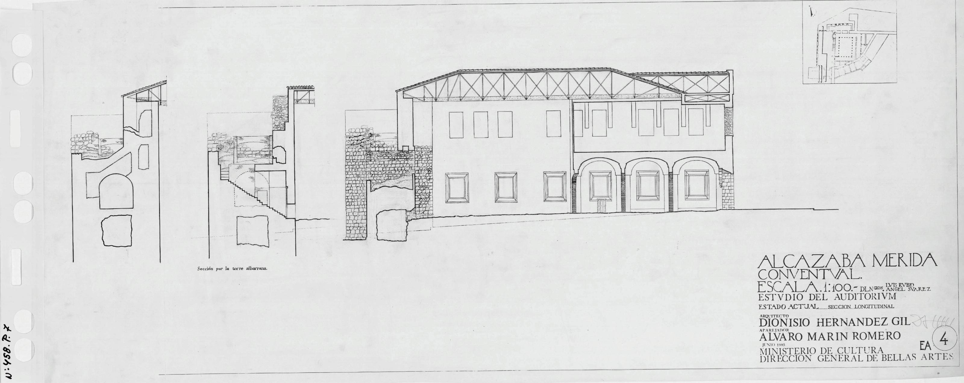 ALCAZABA DE MERIDA (Badajoz) Estudio del Auditorium: SECCION LONGITUDINAL Estado actual Consta además de 2 secciones por la torre albarrana y pequeña planta de ubicación. Sin notas ni cotas. Firmado