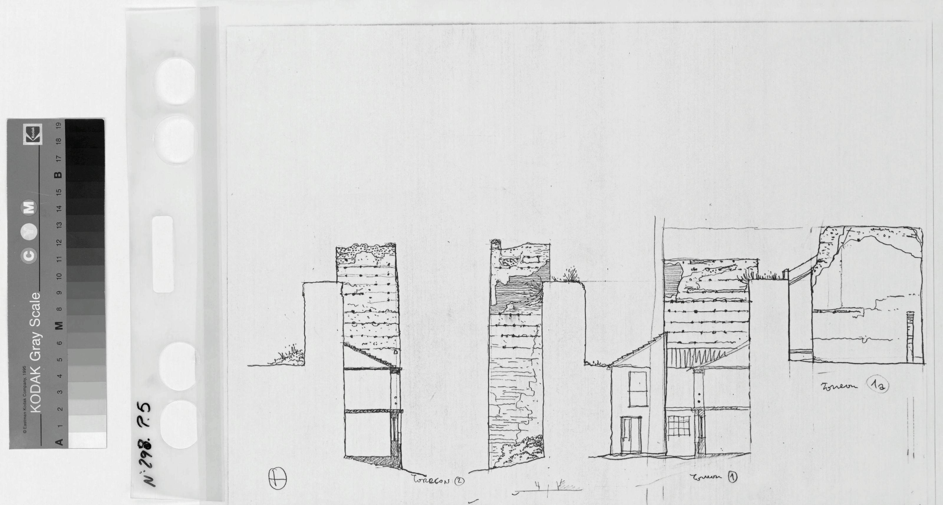 PALACIO ARZOBISPAL Y CURIA .- GRANADA-: ALZADO DE LA MURALLA. Torreones 1 y 2. Con secciones dibujo croquizado. Sin acotar