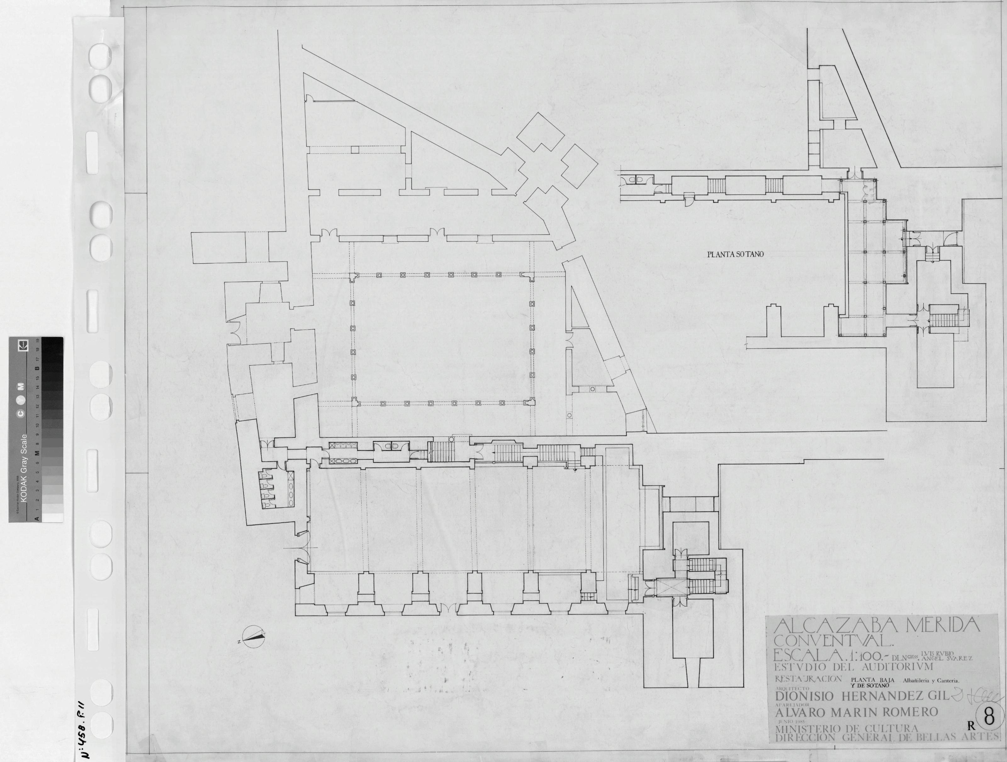 ALCAZABA DE MERIDA (Badajoz) Estudio del Auditorium: PLANTA BAJA Y SOTANO Restauración - Abañilería y Cantería Con escaleras de acceso, distribución y proyecciones techo. Firmado