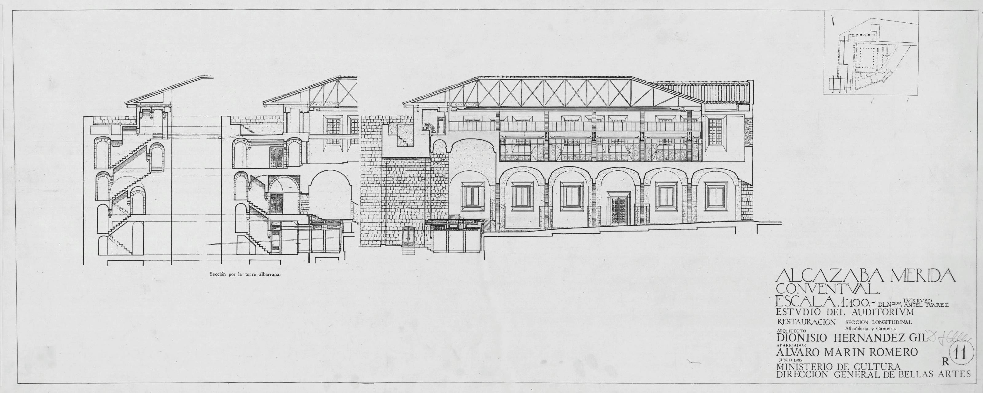 ALCAZABA DE MERIDA (Badajoz) Estudio del Auditorium: SECCION LONGITUDINAL Restauración Abañilería y Cantería Consta además de 2 secciones por la torre albarrana y pequeña planta de ubicación. Con dibujo de terminacion de paramentos. Sin notas ni cotas. Firmado