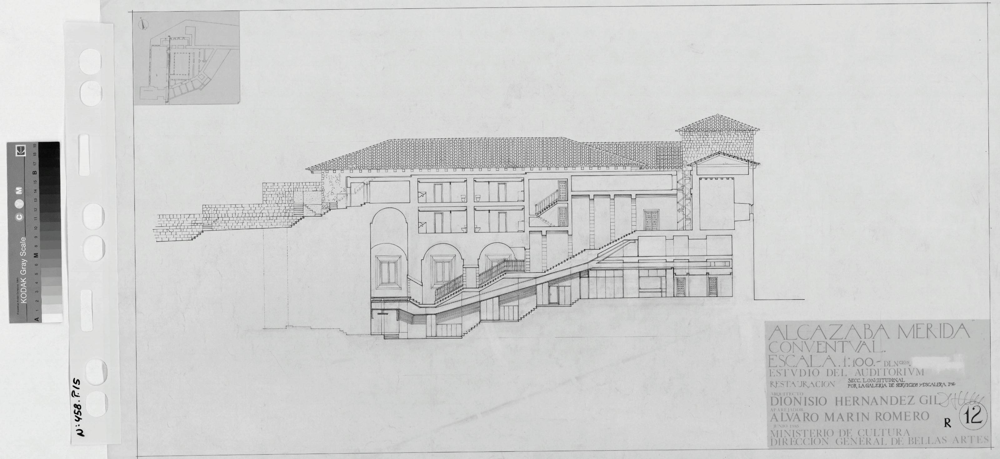 ALCAZABA DE MERIDA (Badajoz) Estudio del Auditorium: SECCION LONGITUDINAL Por la galería de servicios y escalera pral. Restauración Albañilería y Cantería Despiece de paramentos en proyección y trama adhesiva de teja, pequeña planta de ubicación. Sin notas ni cotas. Firmado
