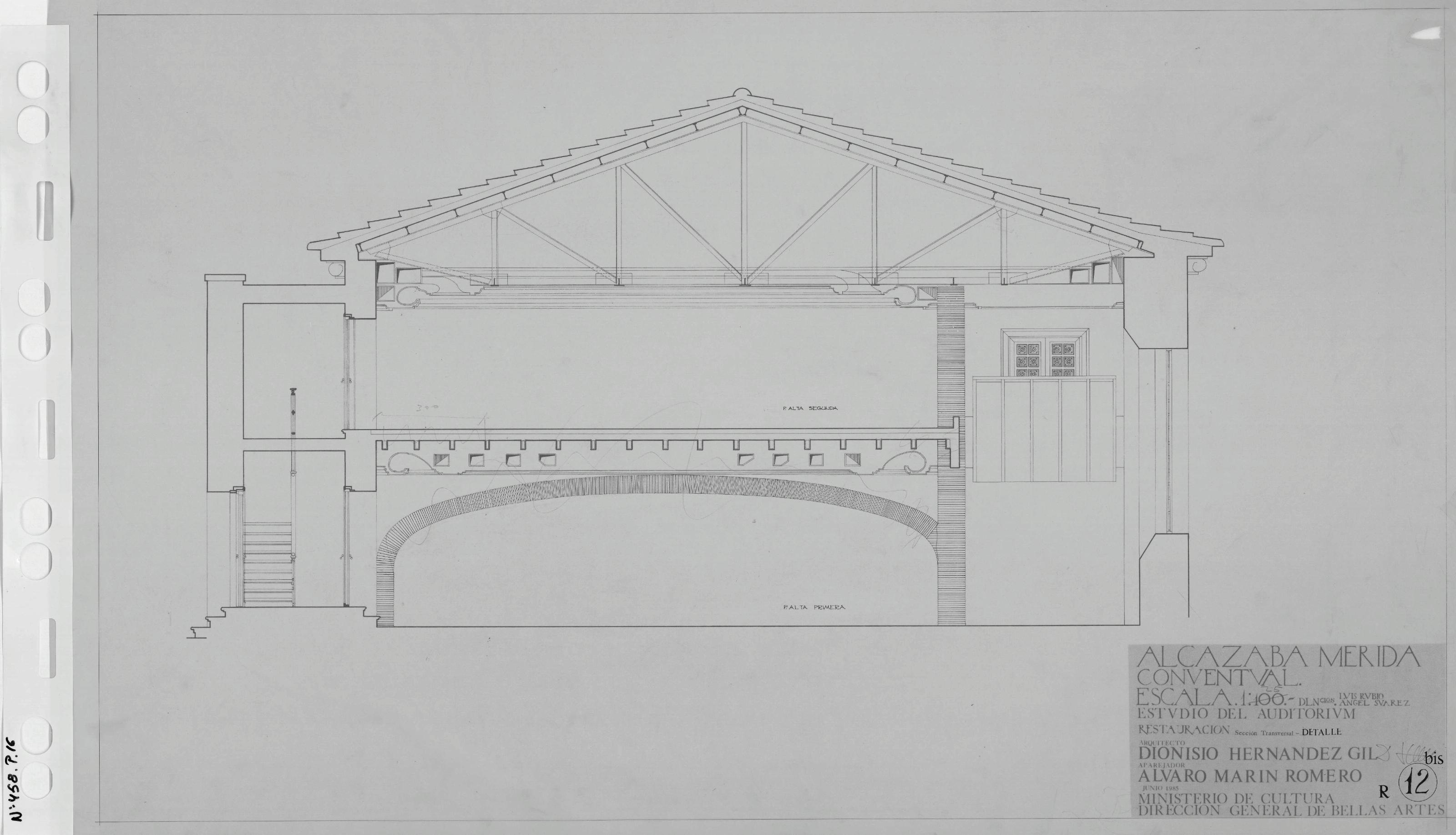 ALCAZABA DE MERIDA (Badajoz) Estudio del Auditorium: SECCION TRANSVERSAL Detalle - Restauración Alguna zona tachada con lápiz y alguna anotación también a lápiz La sección refleja las dos plantas altas (primera y segunda) y cubierta. Firmado