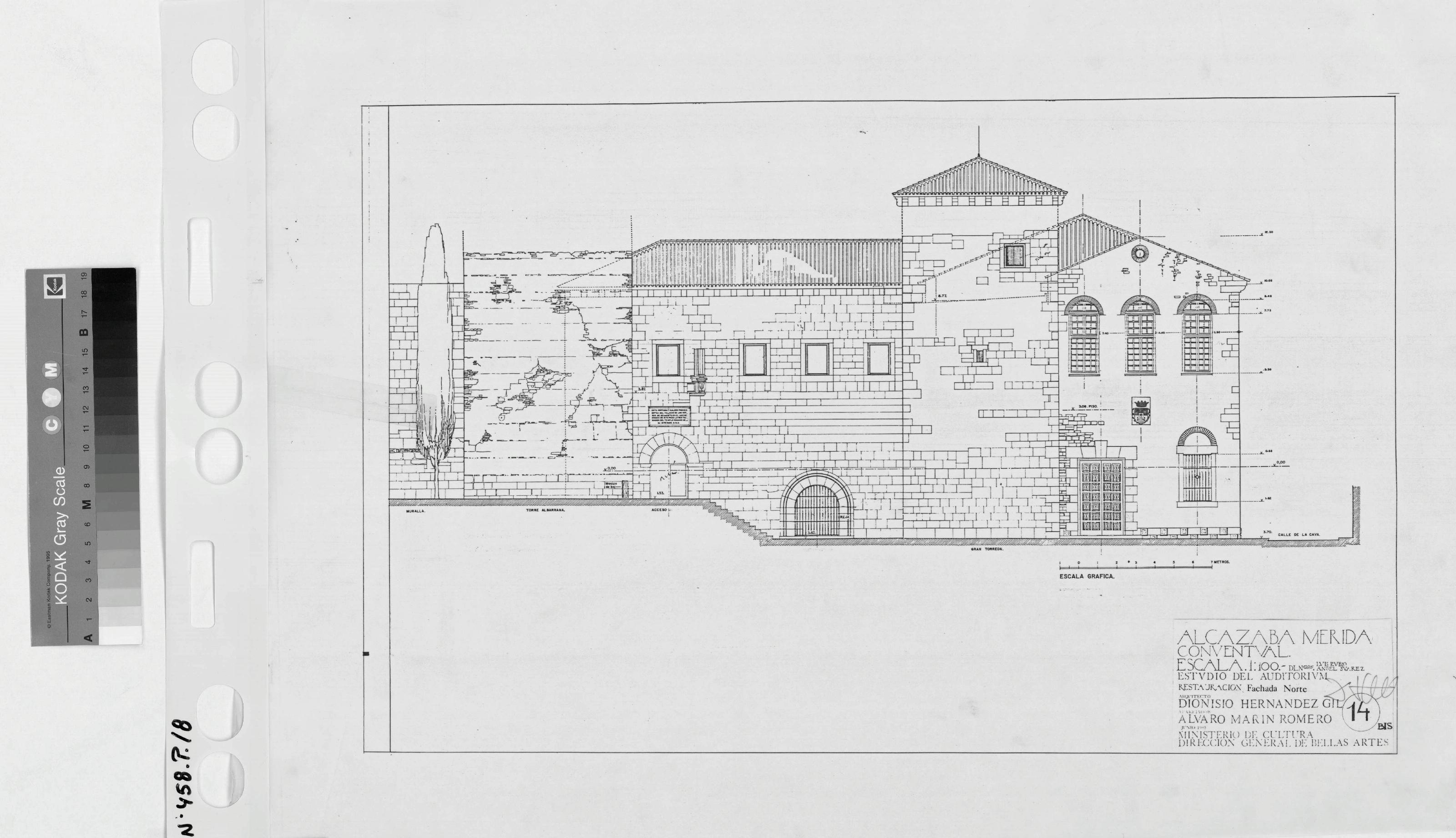 ALCAZABA DE MERIDA (Badajoz) Estudio del Auditorium: ALZADO NORTE Restauración Con rayados y despieces, con notas y cotas de nivel. Firmado