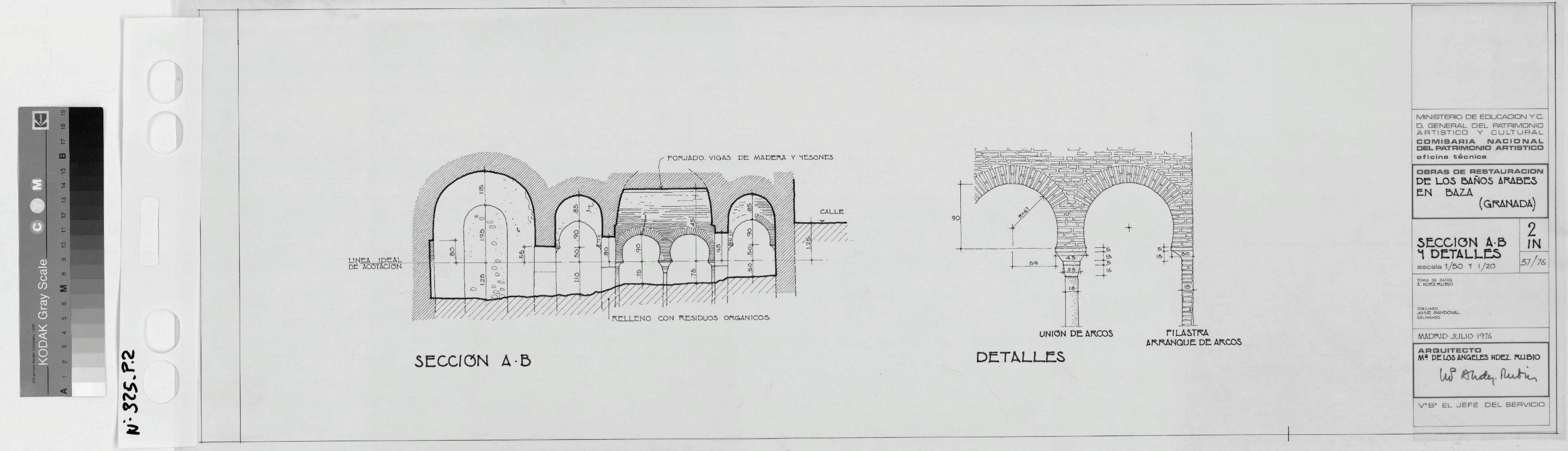 BAÑOS ARABES .- GRANADA-: SECCION Y DETALLES. Seccion longitudinal acotada, plano de detalles con el arranque, de los arcos, y pilastra, escala de seccion 1/50, escala de detalle 1/20. Dibujo acotado.