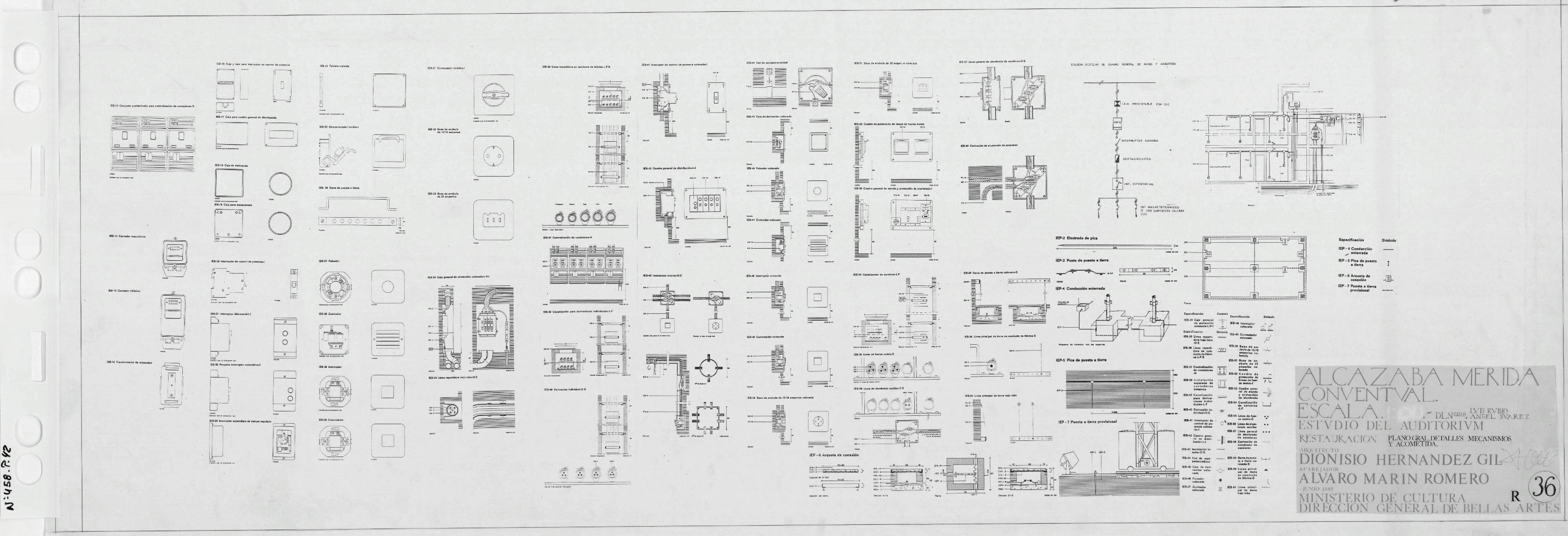 ALCAZABA DE MERIDA (Badajoz) Estudio del Auditorium: ELECTRICIDAD - Restauración - Plano General Mecanismos y Acometidas Con Leyenda. Multitud de Detalles a diferentes escalas tomados de normativa. Firmado