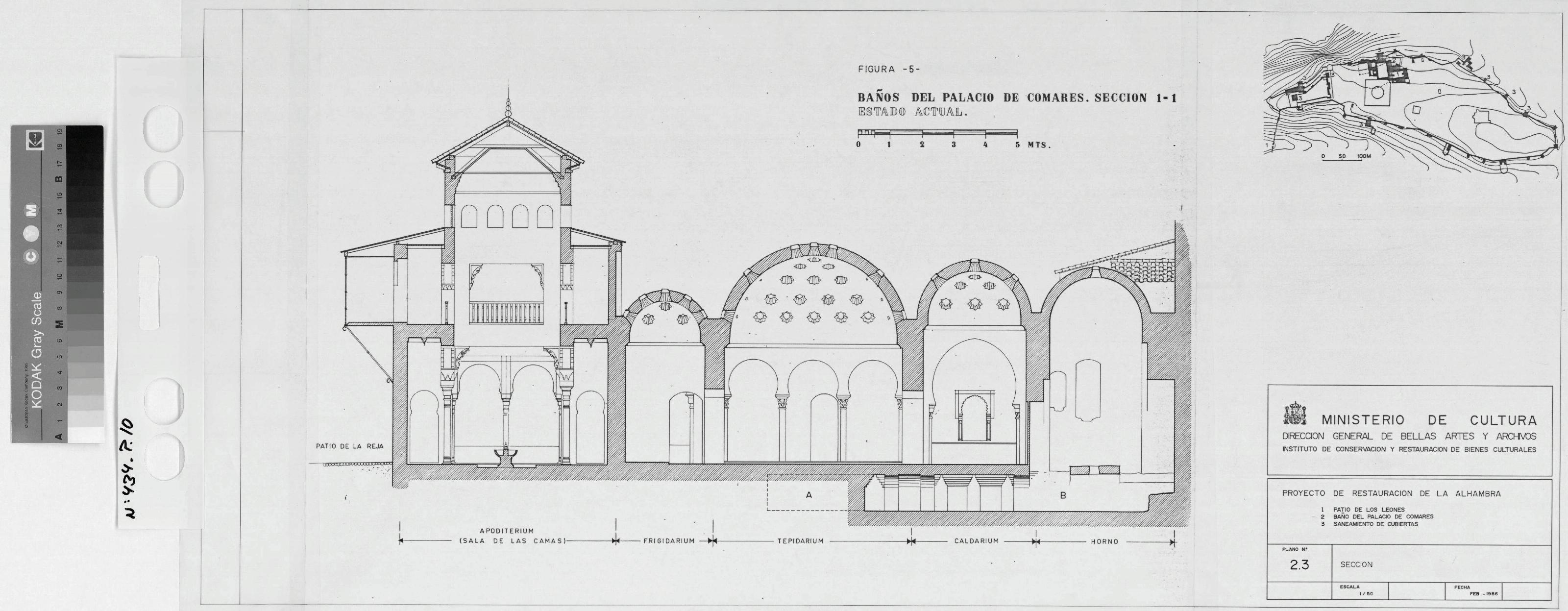 LA ALHAMBRA . -GRANADA-: SECCION, BAÑOS DEL PALACIO DE COMARES. Estado actual, en esta seccion se marcan las dependencias, plano sin cotas.
