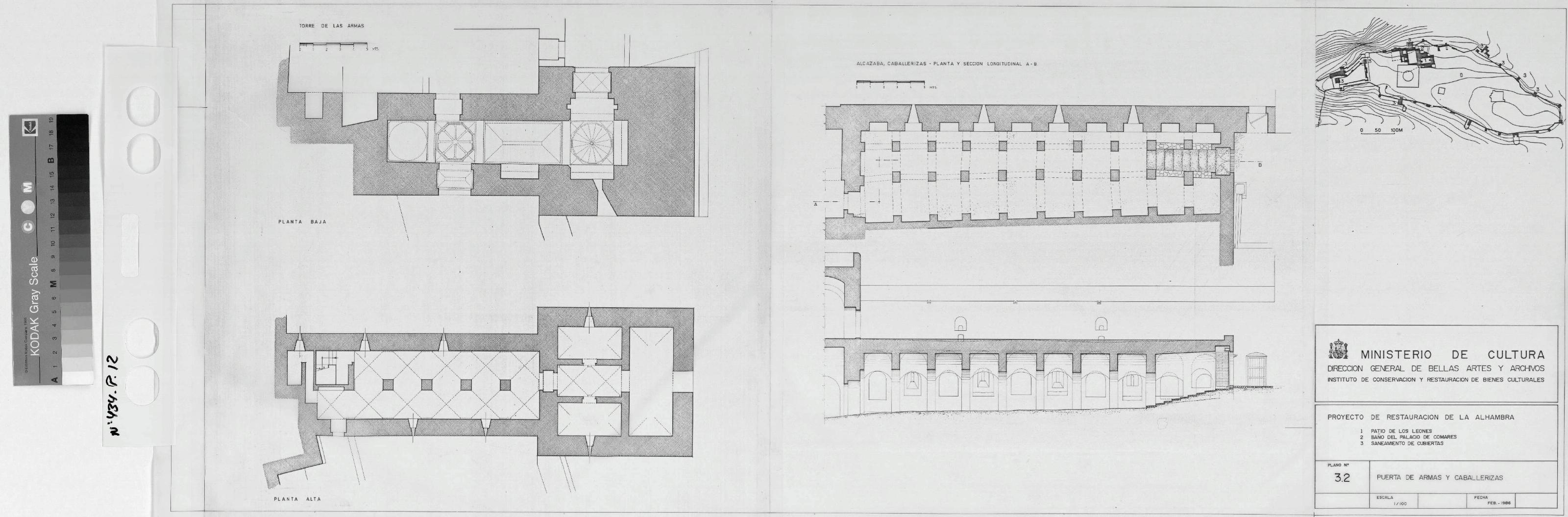 LA ALHAMBRA . -GRANADA-: PUERTA DE ARMAS Y CABALLERIZAS Plantas baja y alta , Alcazaba caballerizas - planta y seccion longitudinal , plano sin cotas.