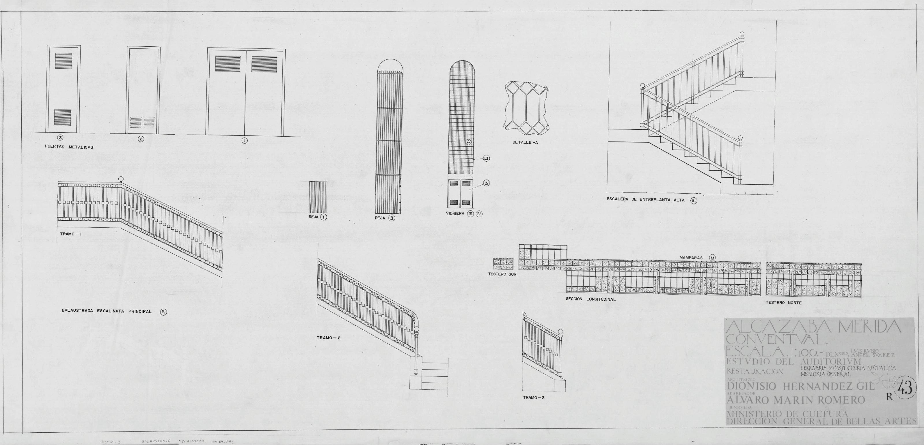 ALCAZABA DE MERIDA (Badajoz) Estudio del Auditorium: Restauración - CERRAJERIA Y CARPINTERIA METALICA - Memoria General Sin nº de unidades ni cotas. Incluye Vidriera, Balaustradas y Mampara a diferentes escalas. Firmado