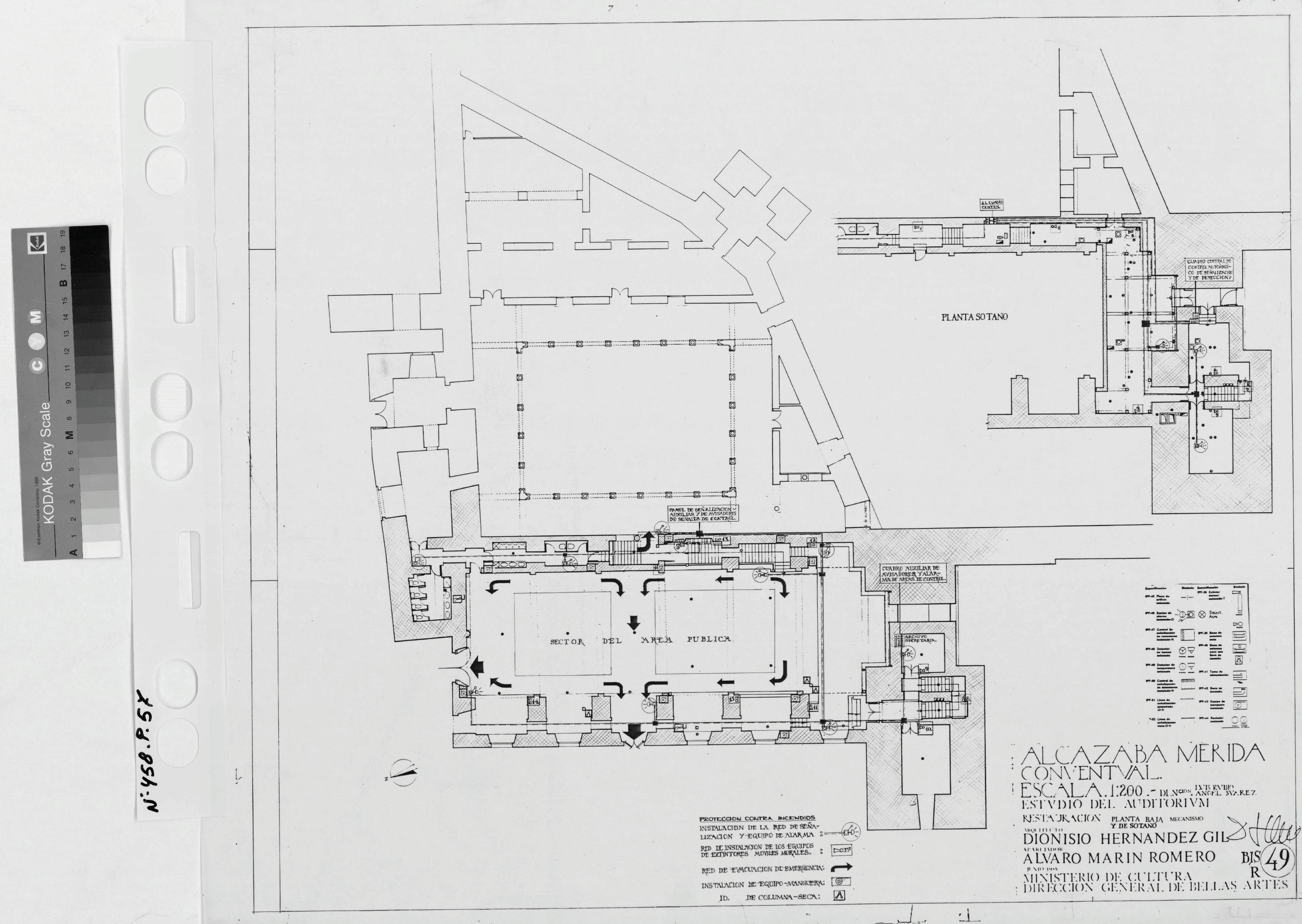 ALCAZABA DE MERIDA (Badajoz) Estudio del Auditorium: PLANTAS BAJA Y SOTANO - Restauración - PROTECCIÓN CONTRA INCENDIOS Representación de mecanismos.Incluye Red de Evacuación de Emergencia y señalizaciones. Con Leyenda. Firmado