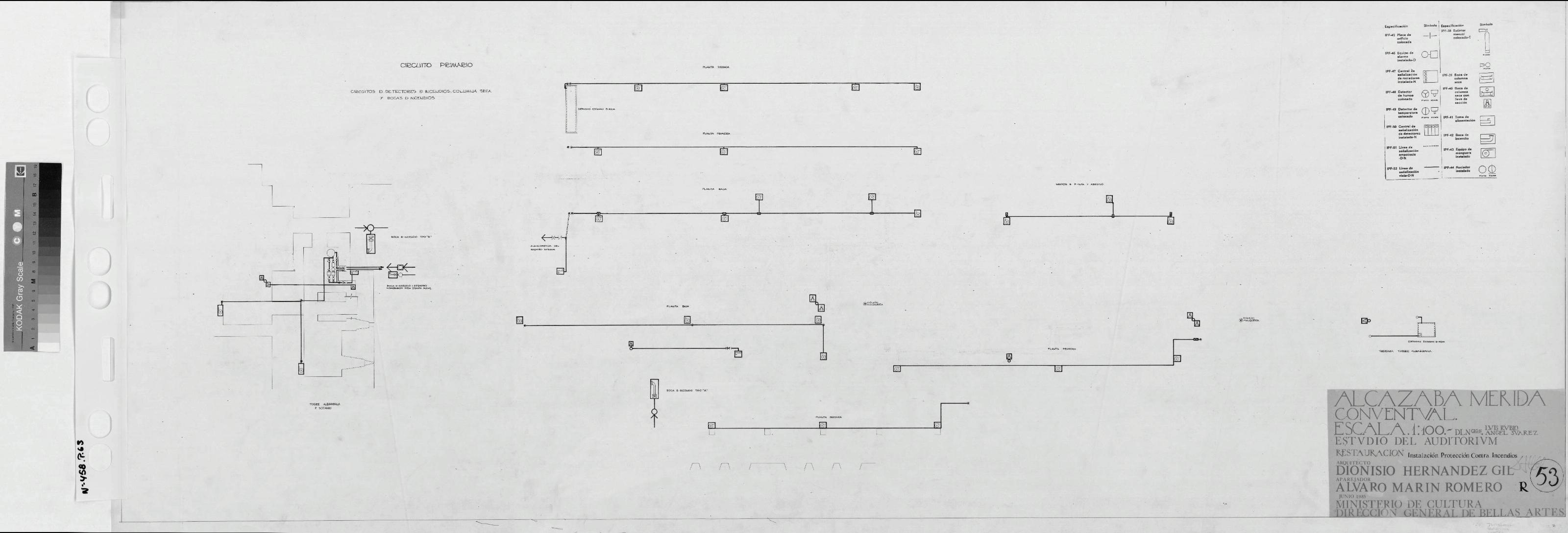ALCAZABA DE MERIDA (Badajoz) Estudio del Auditorium: PROTECCIÓN CONTRA INCENDIOS - Circuito Primario Circuitos de detectores, Columna seca y bocas. Circuitos en sus diferentes plantas. Con leyenda y Firmado