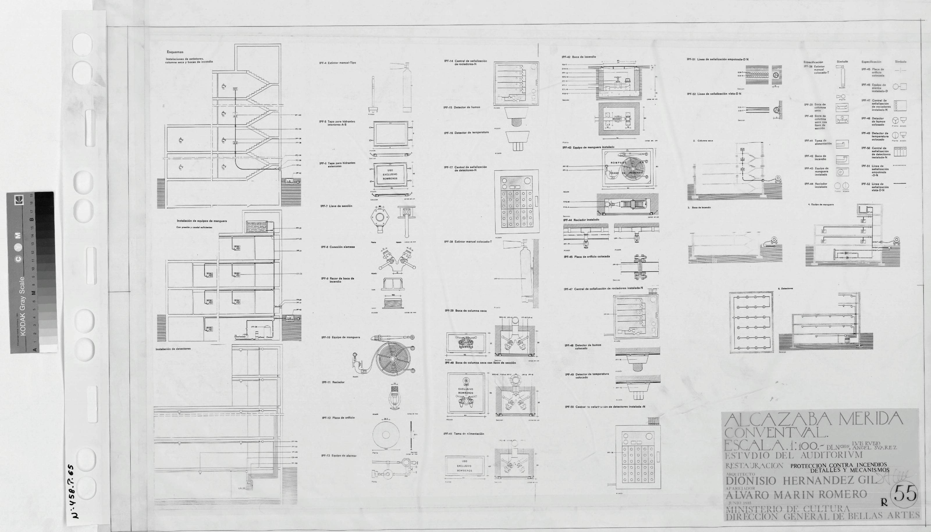 ALCAZABA DE MERIDA (Badajoz) Estudio del Auditorium: PROTECCIÓN CONTRA INCENDIOS - Detalles y mecanismos Esquemas en sección de instalación de extintores, circuitos con manguera y detectores. Multitud de detalles tomados de Normativa con esquemas y leyendas. Firmado