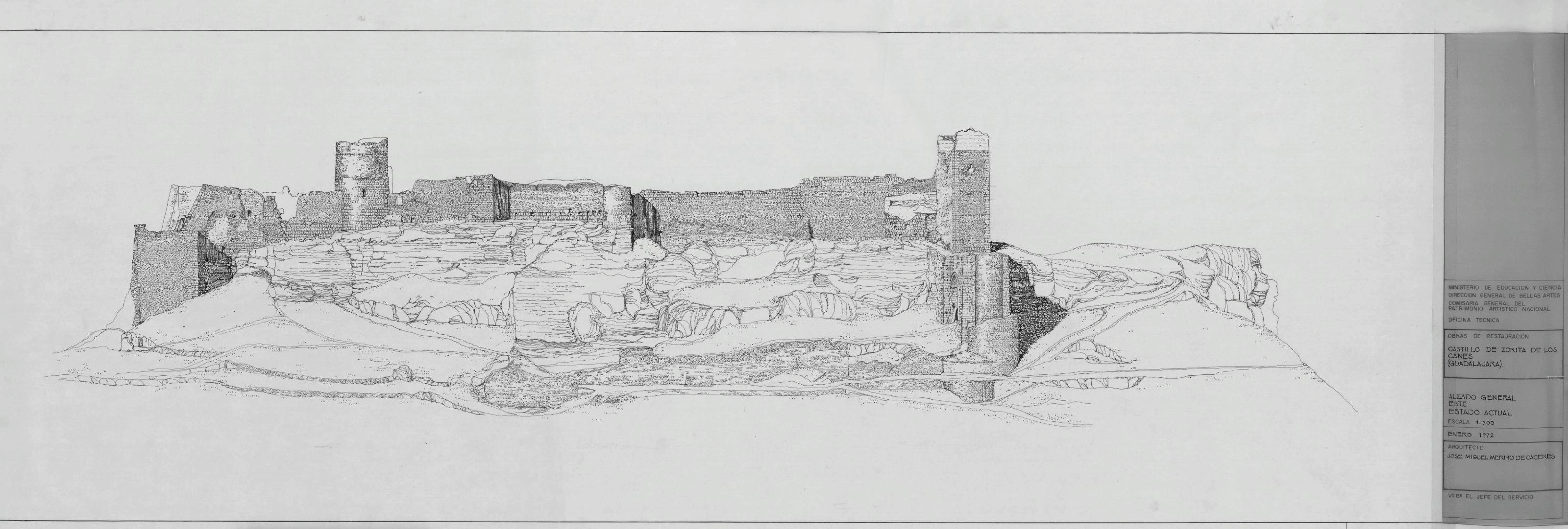 CASTILLO DE ZORITA DE LOS CANES. - GUADALAJARA -: ALZADO GENERAL ESTE .Estado actual , plano dibujado con mucho detalle, plano sin cotas.