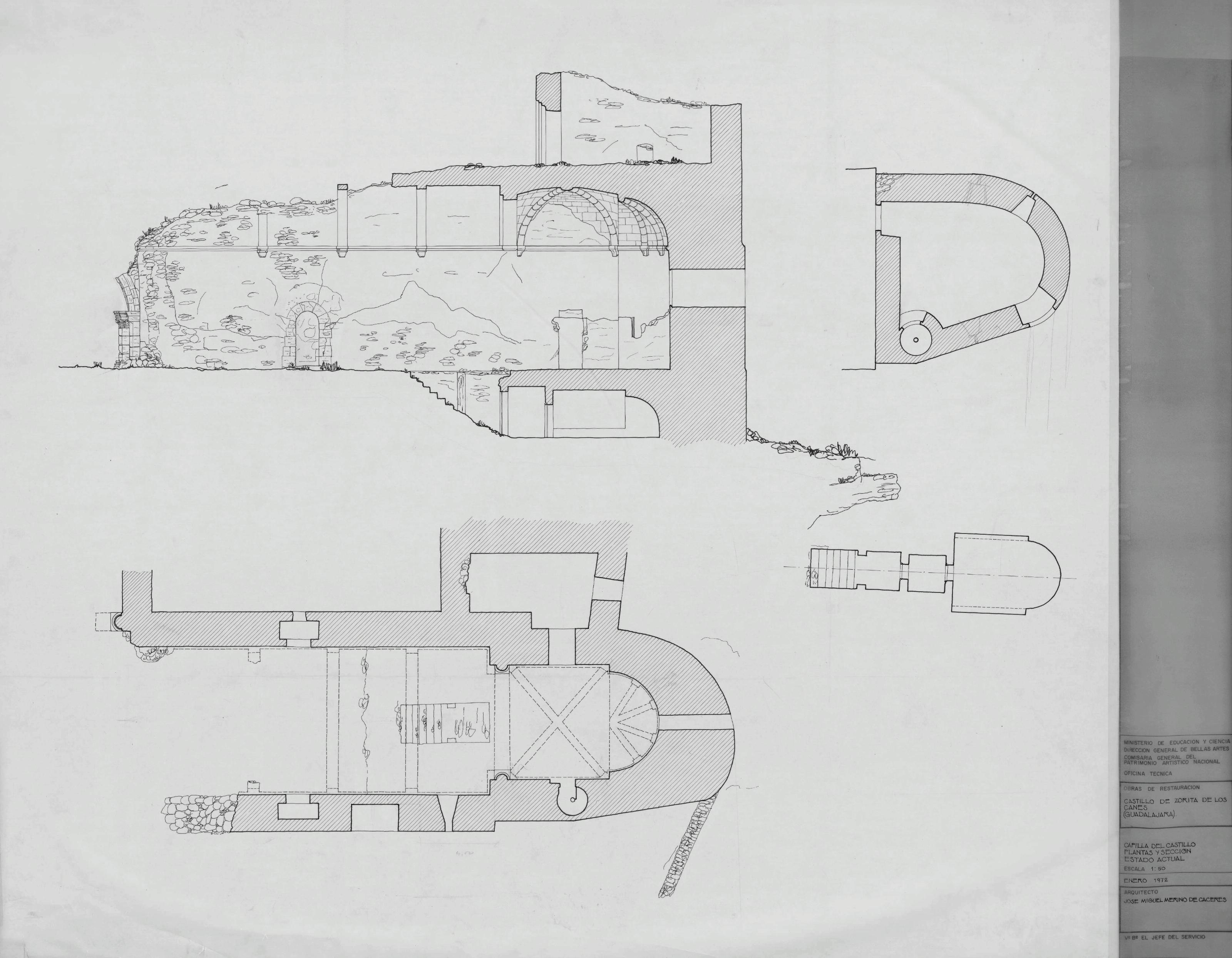 CASTILLO DE ZORITA DE LOS CANES. - GUADALAJARA -: CAPILLA DEL CASTILLO, PLANTAS Y SECCION . Estado actual , plano sin cotas.