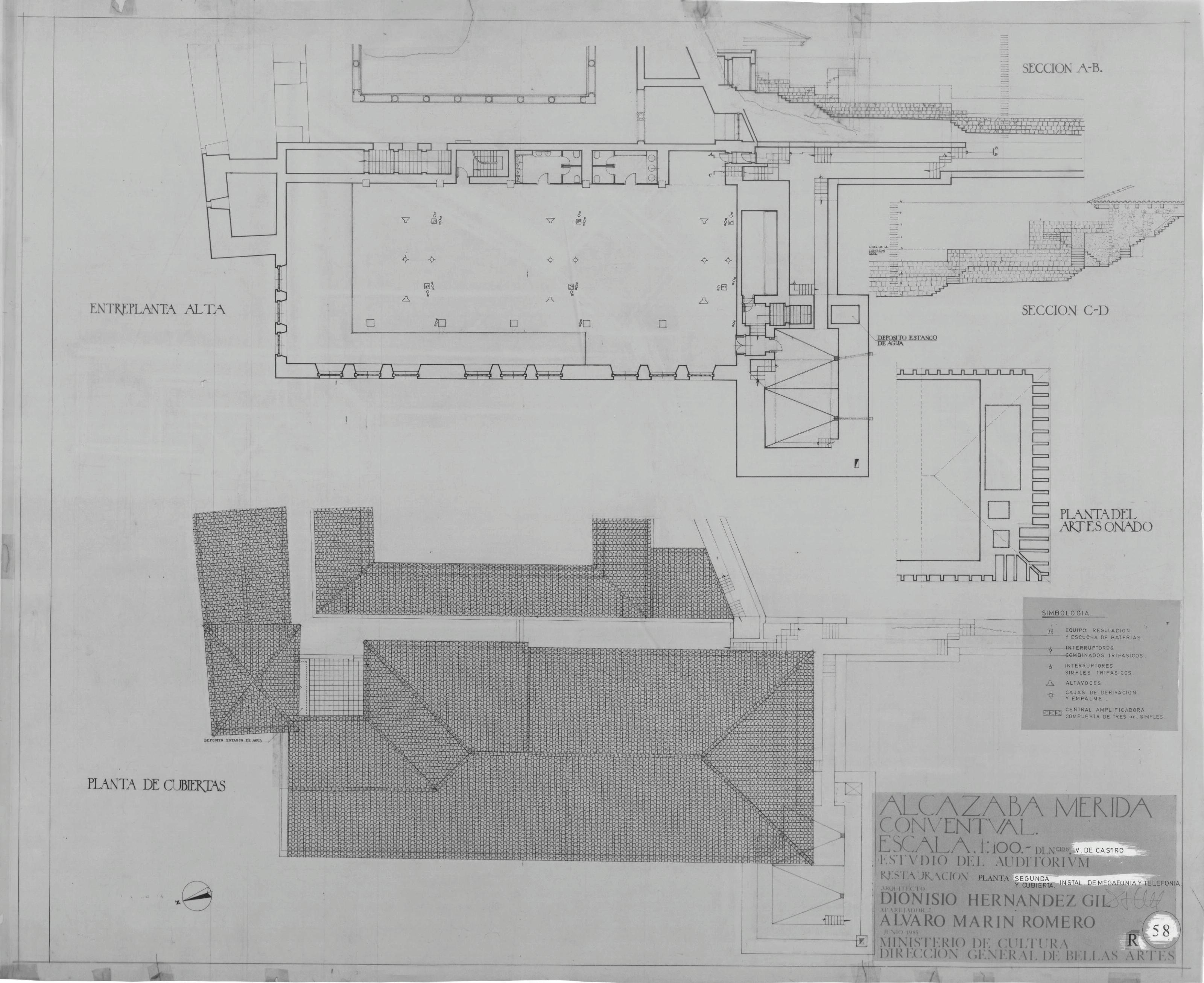 ALCAZABA DE MERIDA (Badajoz) Estudio del Auditorium: P. SEGUNDA - Restauración- Instalación de Megafonía y Telefonía Dibujados símbolos y especificados en Leyenda. Firmado
