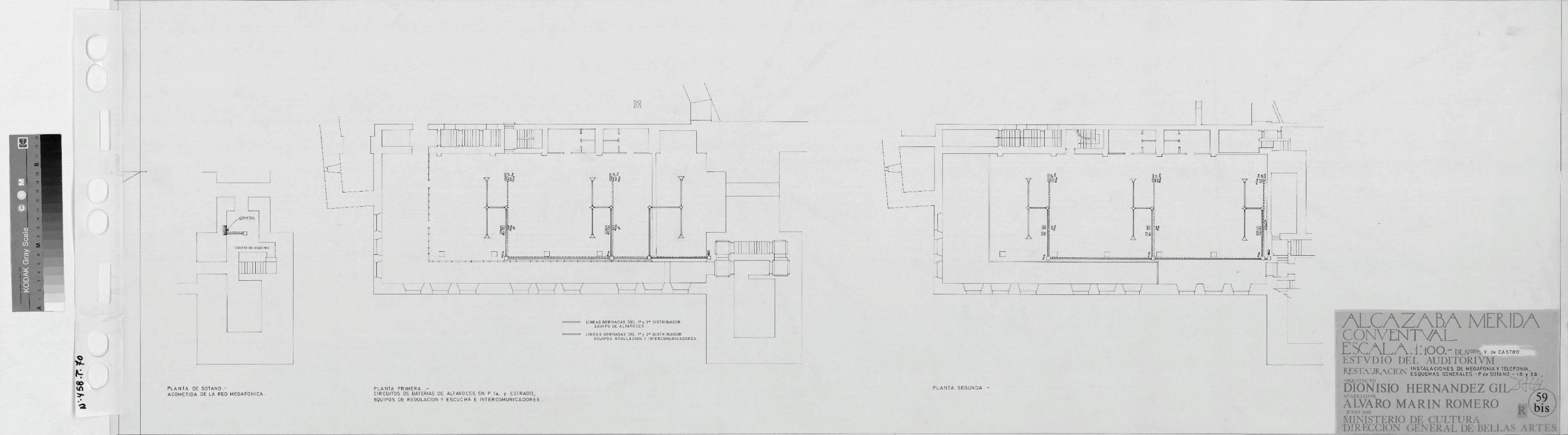 ALCAZABA DE MERIDA (Badajoz) Estudio del Auditorium: P. SOTANO, 1ª Y 2ª - Restauración- Instalación de Megafonía y Telefonía - Esquemas Generales. Circuito general de Baterías de Regulación e Intercomunicadores. Circuito Local de Altavoces. Con Leyendas y Firmado.