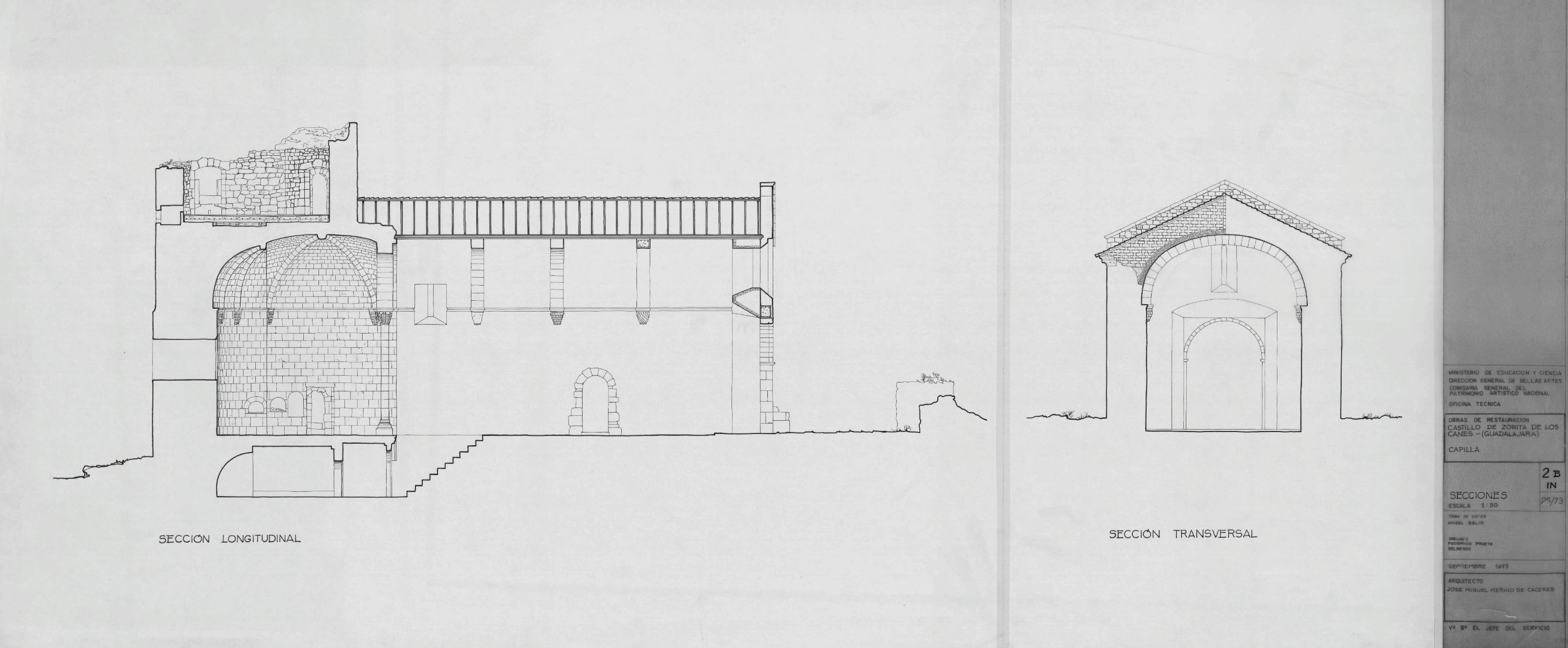 CASTILLO DE ZORITA DE LOS CANES. - GUADALAJARA -: CAPILLA. SECCIONES, longitudinal y transversal. Plano sin cotas.