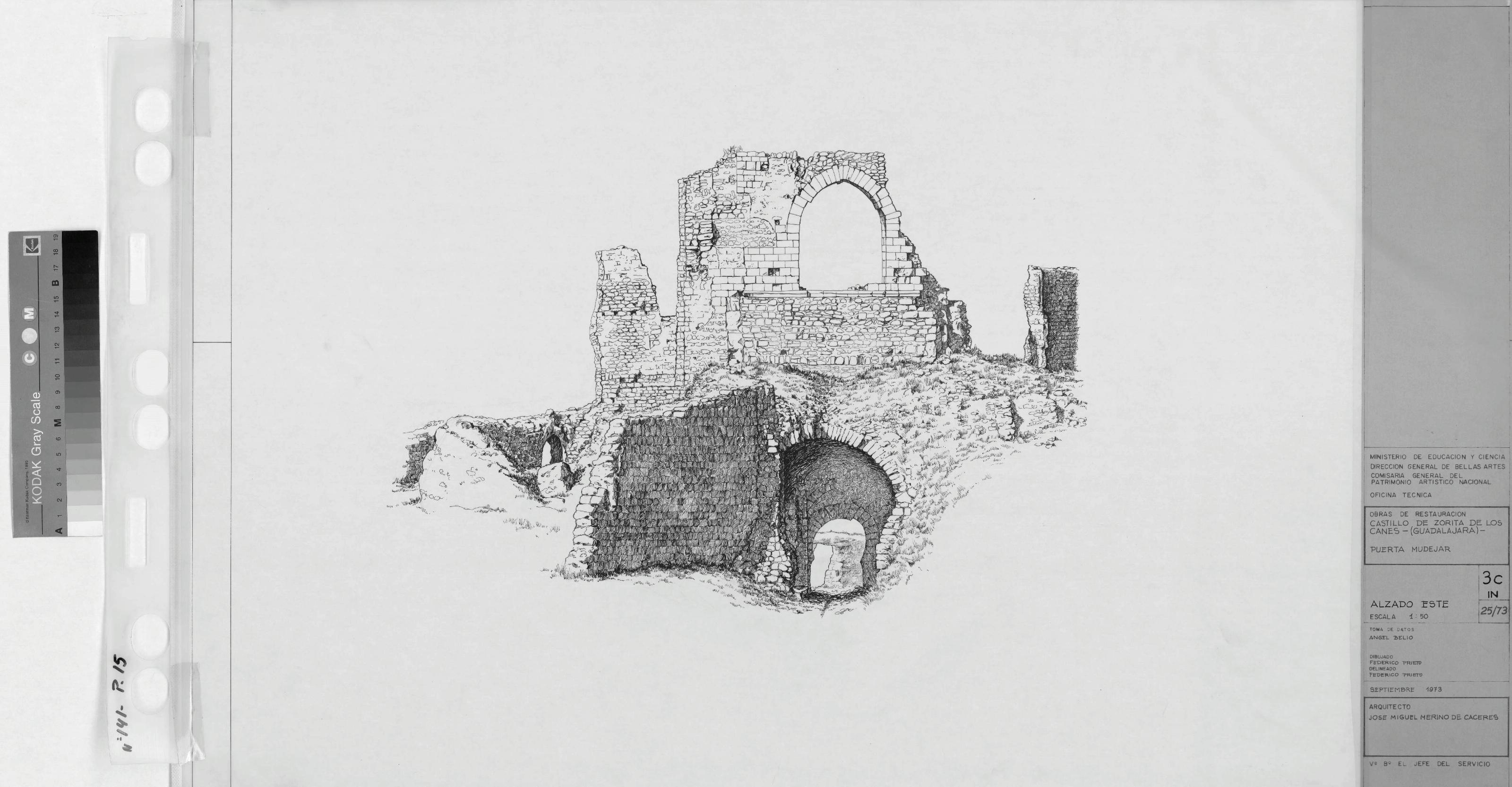 CASTILLO DE ZORITA DE LOS CANES. - GUADALAJARA -: PUERTA MUDEJAR, ALZADO ESTE, Plano dibujado con mucho detalle, sin cotas.