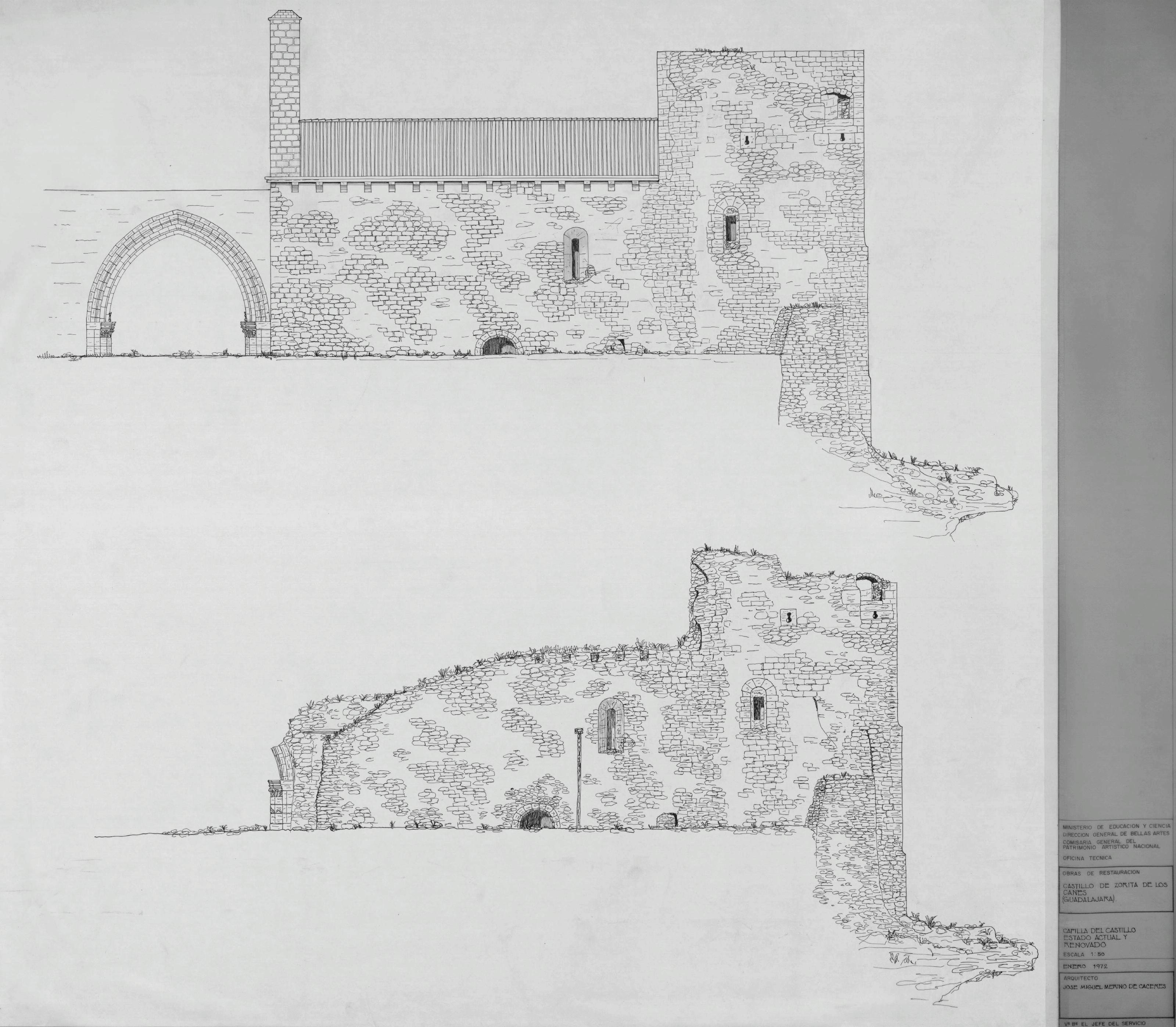 CASTILLO DE ZORITA DE LOS CANES. - GUADALAJARA -: CAPILLA DEL CASTILLO, ESTADO ACTUAL Y REFORMADO, planos dibujados con mucho detalle, sin cotas.