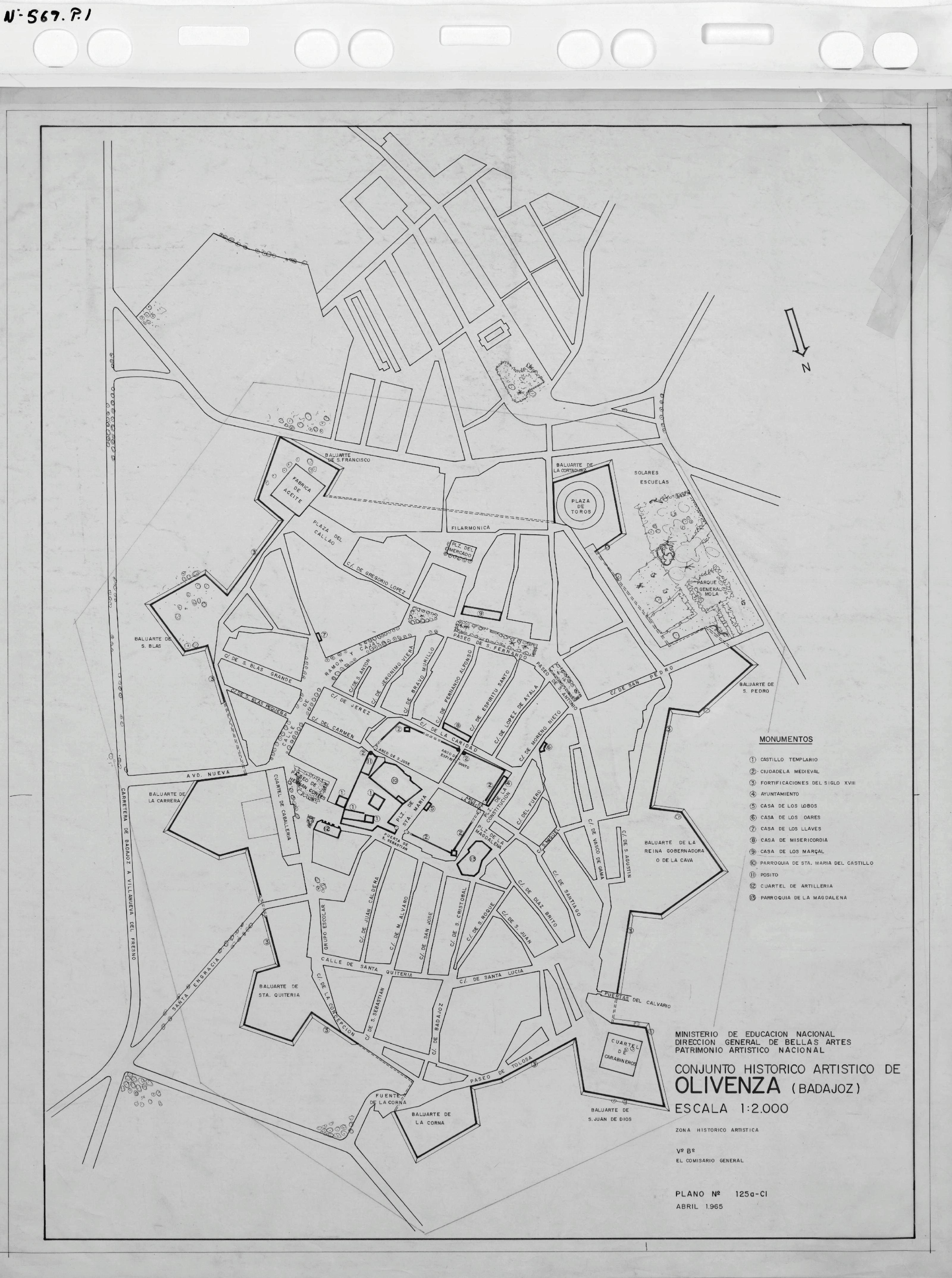 CONJUNTO HISTORICO ARTISTICO DE OLIVENZA (Badajoz): PLANTA GENERAL DEL RECINTO - Zona histórico Artística Con accesos y nomenclatura de calles y baluartes así como representación con leyenda de los principales monumentos. Sin firmar