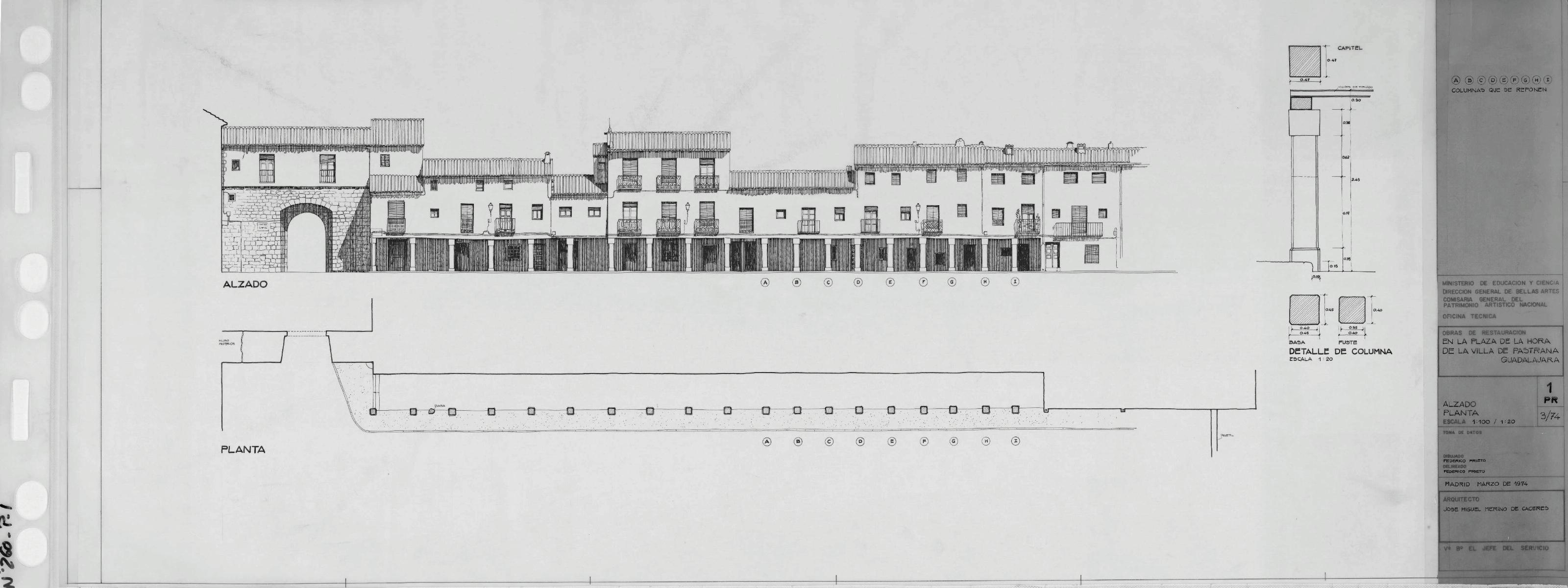 PLAZA DE LA HORA - GUADALAJARA-: ALZADO, PLANTA Y DETALLE. Alzado dibujado con mucho detalle, las columnas que se van a reparar estan numeradas, y plano de planta con escala los dos 1/100, el detalle de columna esta acotado , a escala 1/20