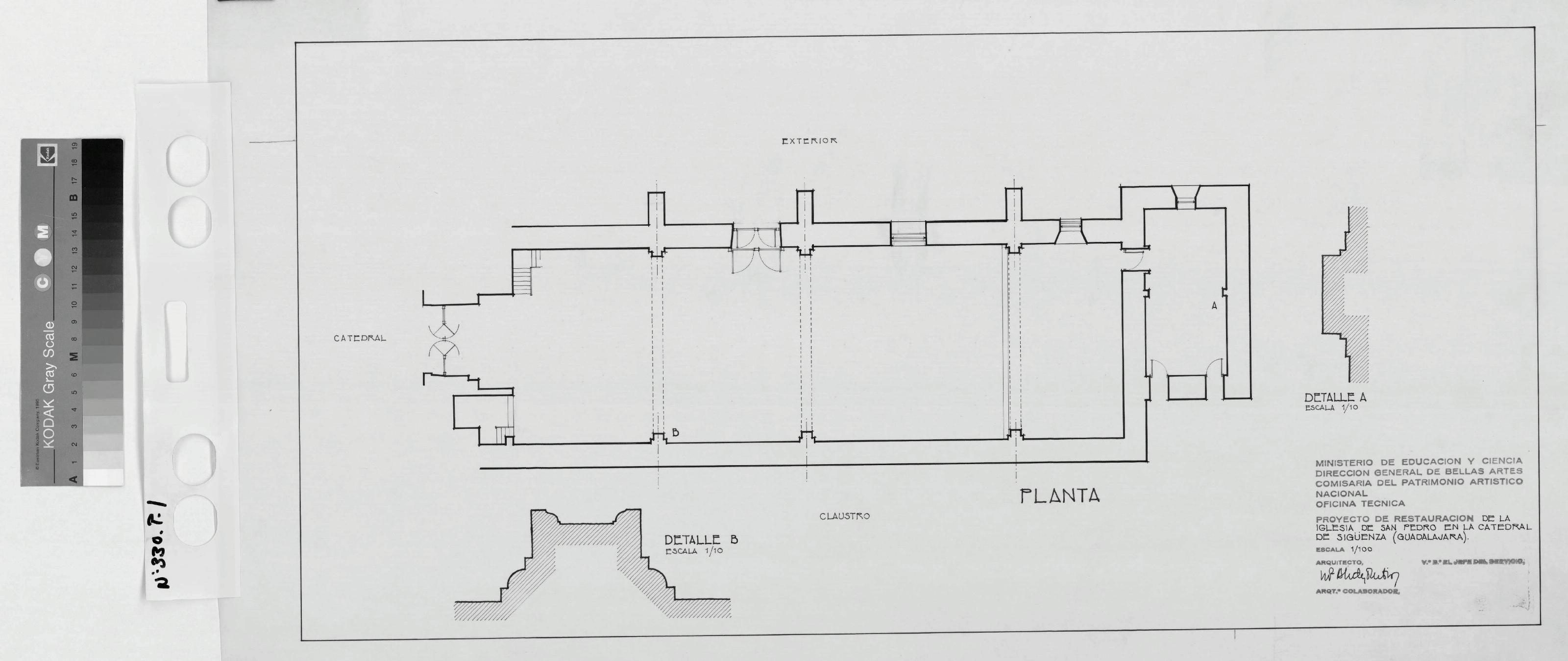 IGLESIA DE SAN PEDRO EN LA CATEDRAL DE SIGÜENZA - GUADALAJARA-: PLANTA Y DETALLES, plano de planta de la iglesia, con muros regruesados, y dos detalles de pilares, plano sin cotas.
