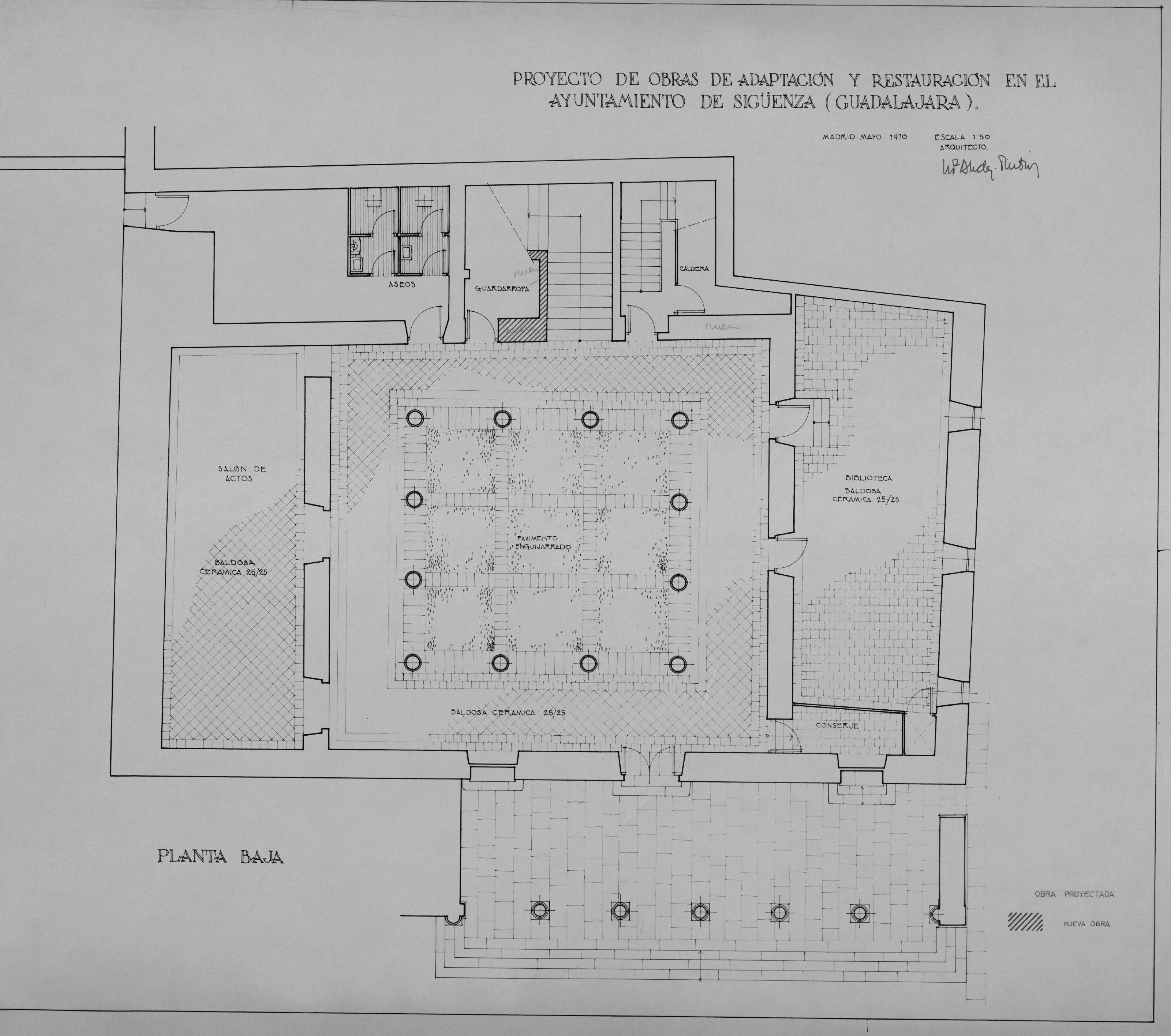 AYUNTAMIENTO DE SIGÜENZA - GUADALAJARA-: PLANTA BAJA , PROYECTO DE ADAPTACION Y RESTAURACION, Planta baja, en este plano vemos una zona marcada de obra en proyecto. plano sin cotas.