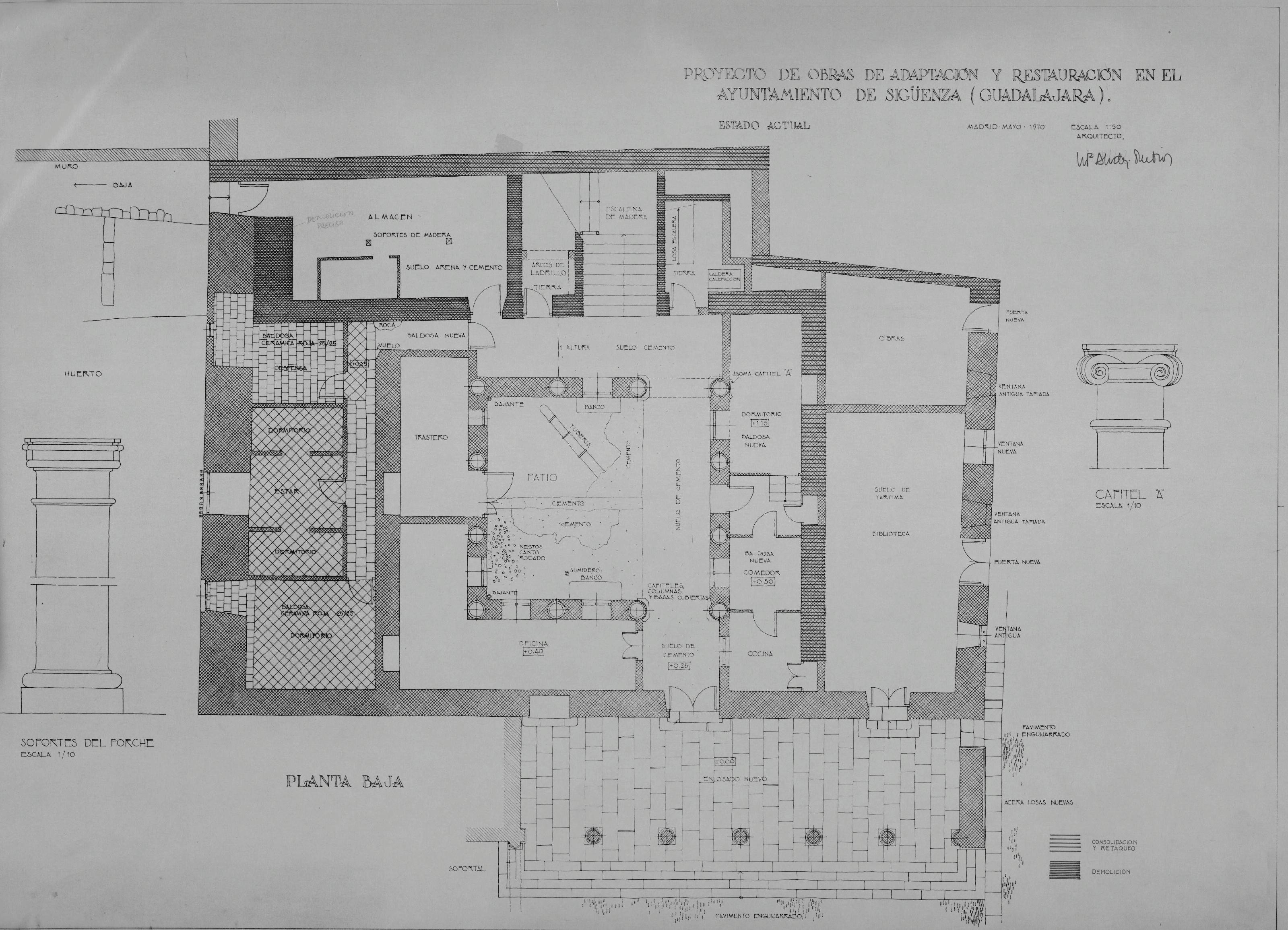 AYUNTAMIENTO DE SIGÜENZA - GUADALAJARA-: PLANTA BAJA , PROYECTO DE ADAPTACION Y RESTAURACION, Planta baja, en este plano vemos una zona marcada de consolidacion y retaqueo, y otra de demolicion. plano sin cotas.