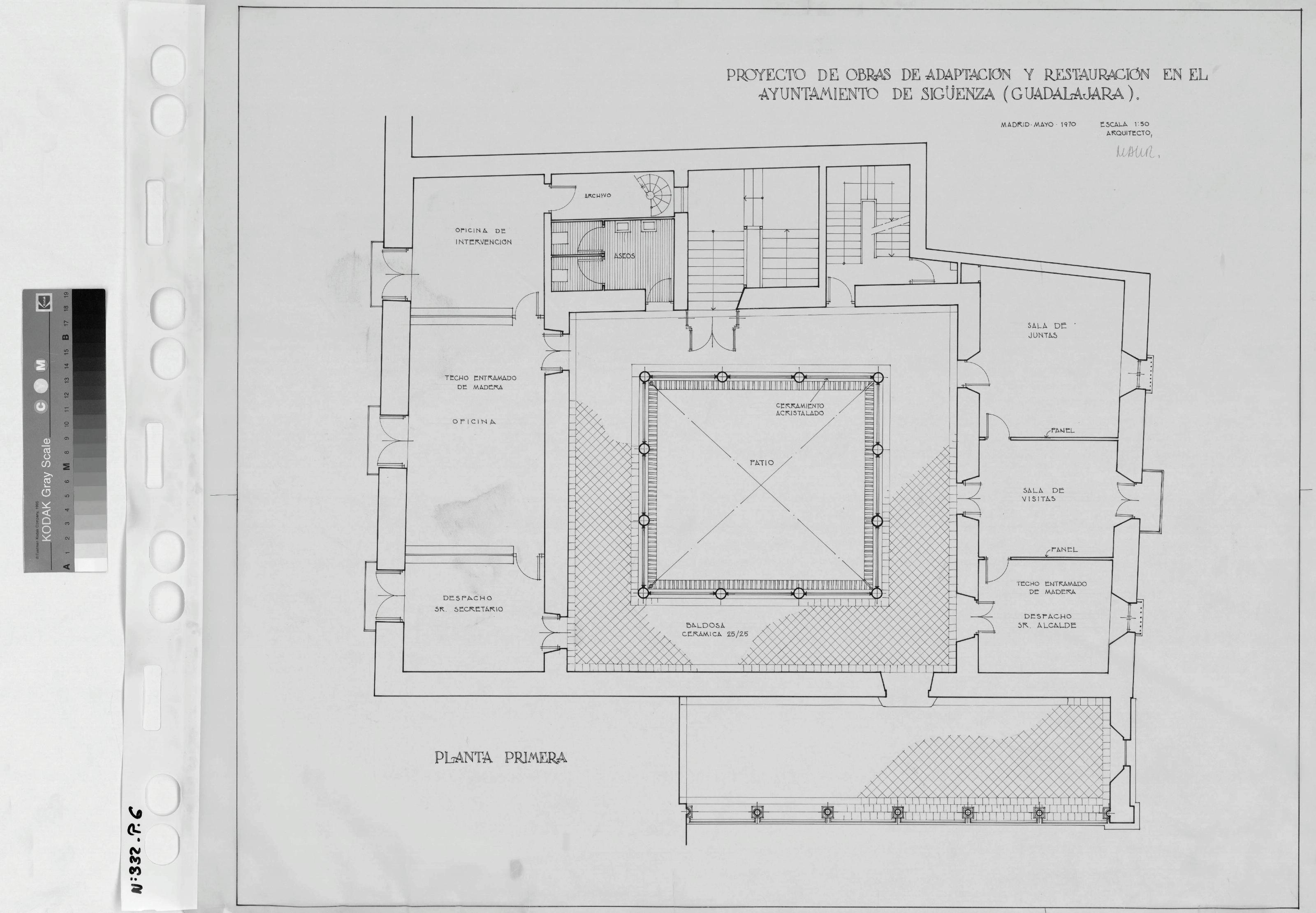 AYUNTAMIENTO DE SIGÜENZA - GUADALAJARA-: PLANTA PRIMERA , PROYECTO DE ADAPTACION Y RESTAURACION, Planta primera, plano de distribucion, y con algunos pavimentos marcados, plano sin cotas.